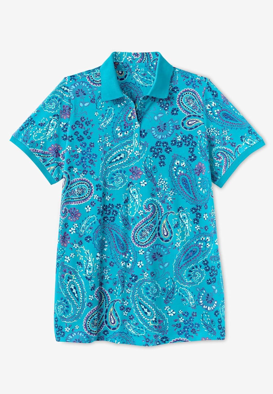 Woman Within Plus Size Perfect Printed Short-Sleeve Polo Shirt(Heather Grey Azure Blossom Vine)