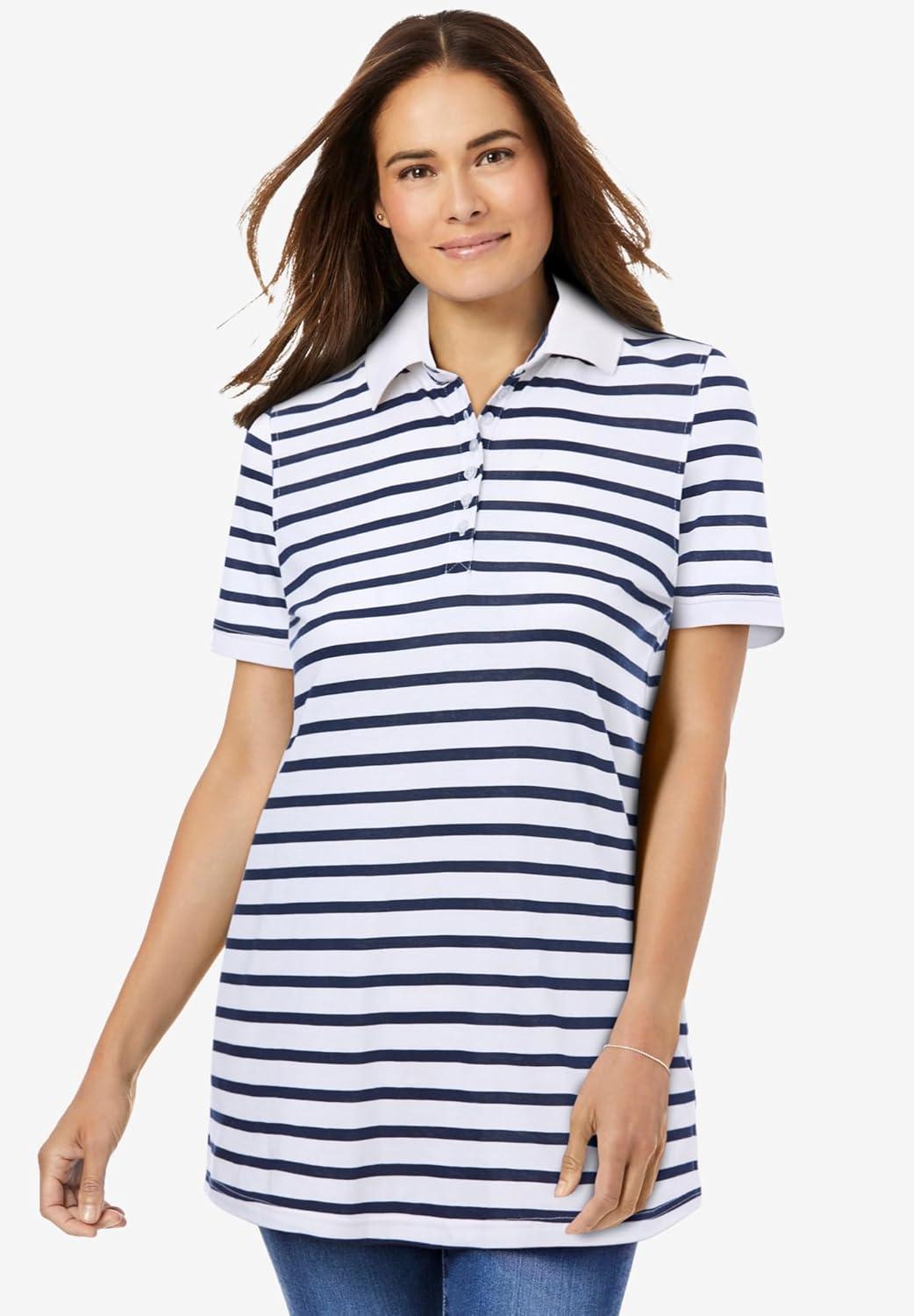 Woman Within Plus Size Perfect Printed Short-Sleeve Polo Shirt(White Butterflies)