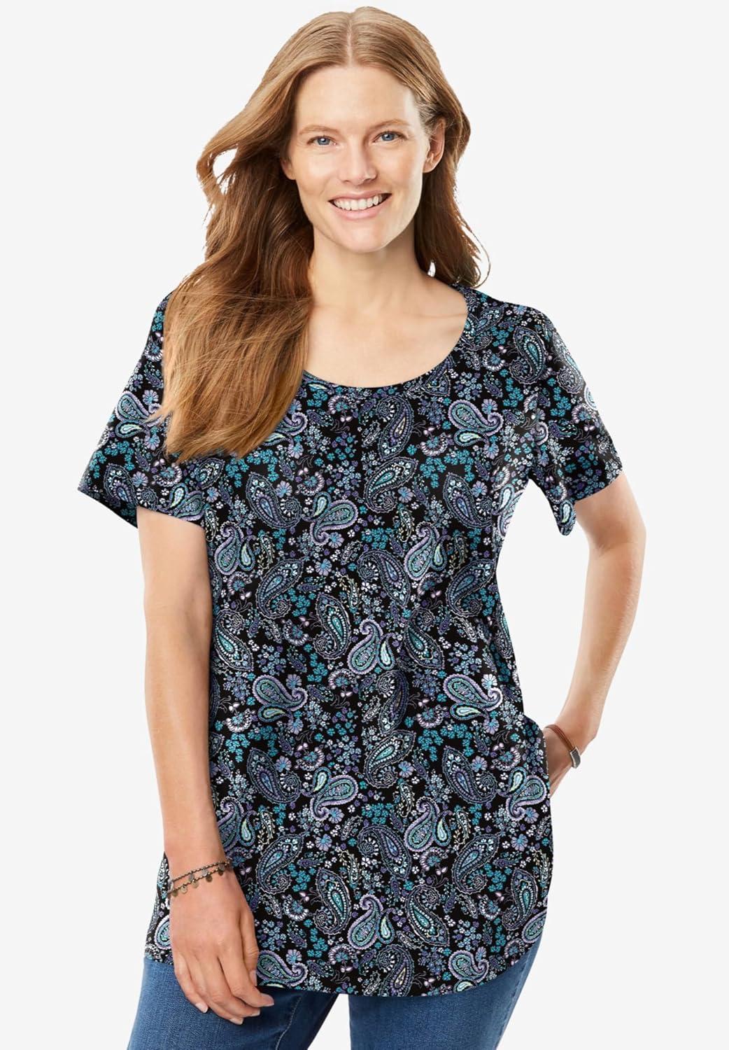 Woman Within Plus Size Perfect Printed Short-Sleeve Scoopneck Tee(Emerald Green Field Floral)