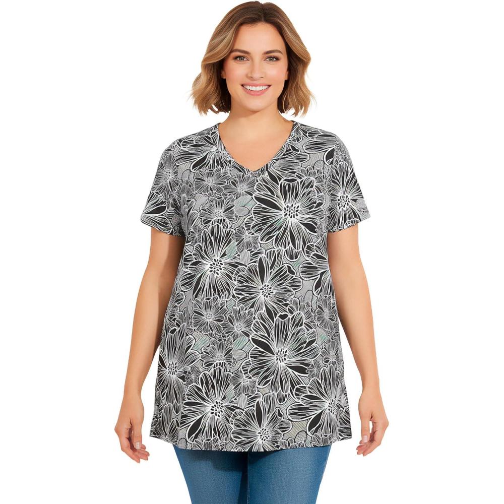 Woman Within Plus Size Perfect Printed Short-Sleeve Shirred V-Neck Tunic(Black Sketch Floral)