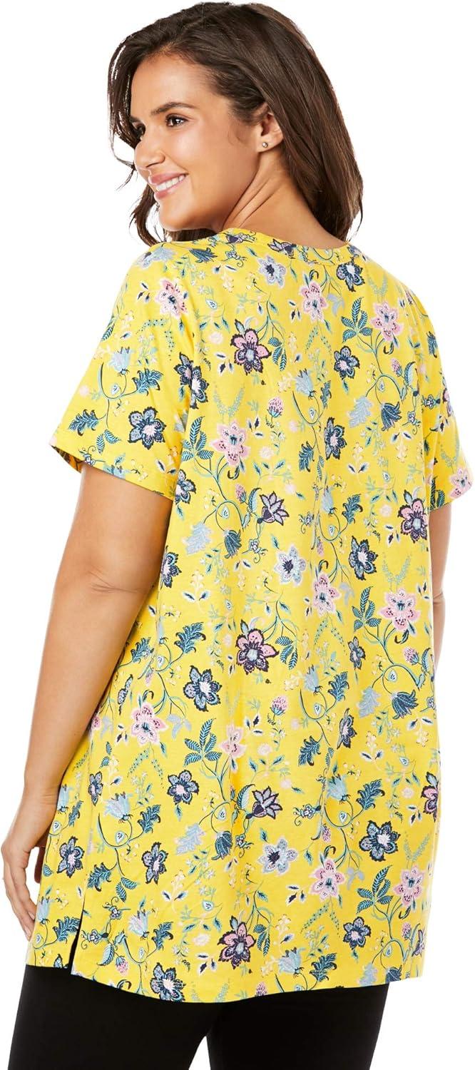 Woman Within Plus Size Perfect Printed Short-Sleeve Shirred V-Neck Tunic(Navy Offset Dot)
