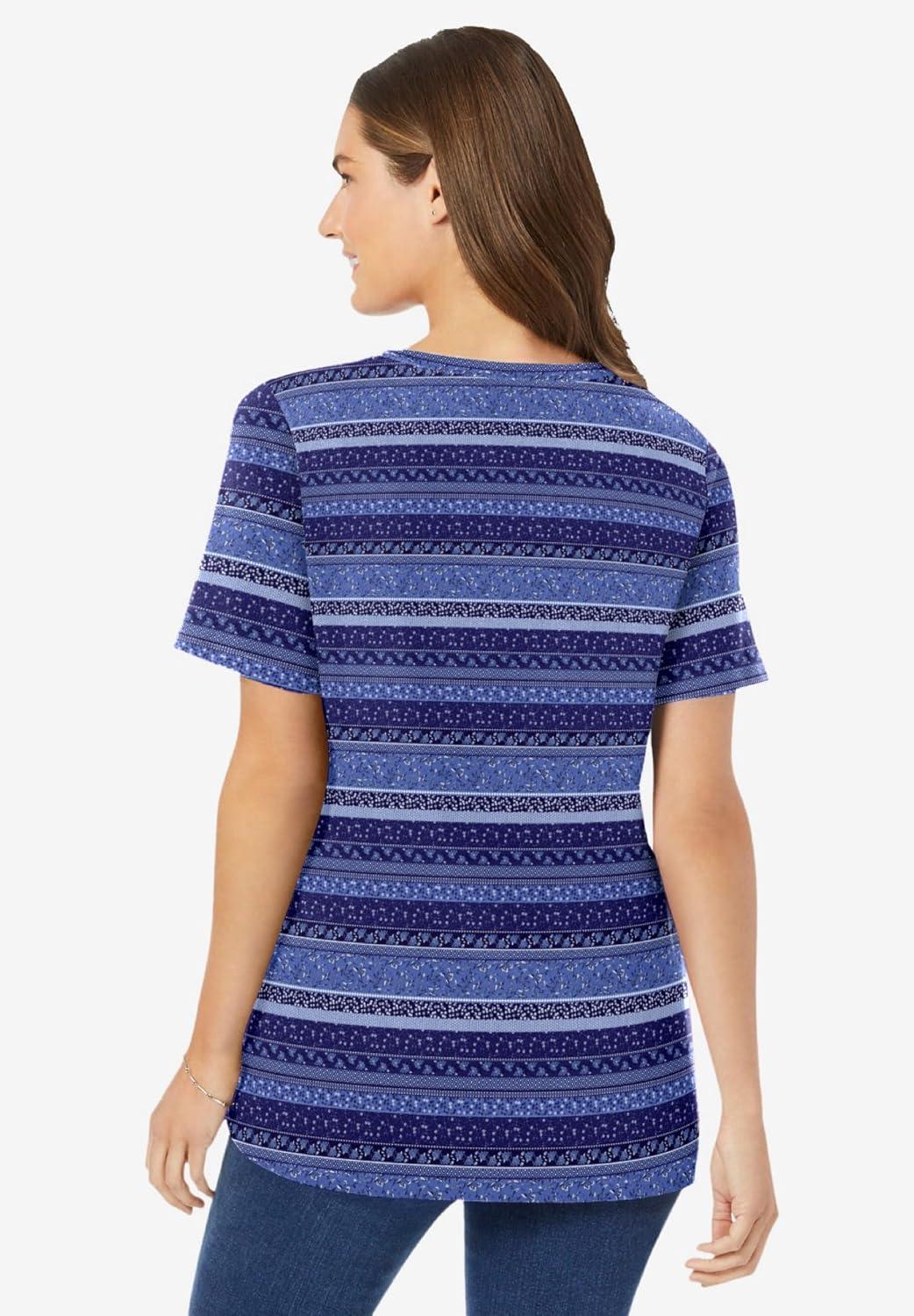 Woman Within Plus Size Perfect Printed Short-Sleeve V-Neck Tee(Navy Patchwork Stripe)