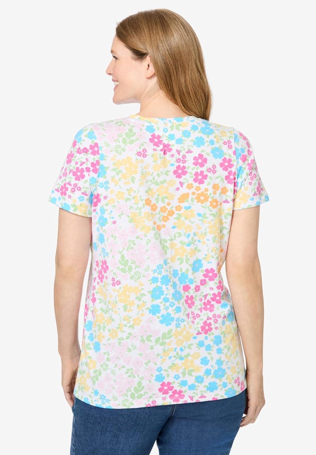 Woman Within Plus Size Perfect Printed Short-Sleeve V-Neck Tee(White Multi Floral)