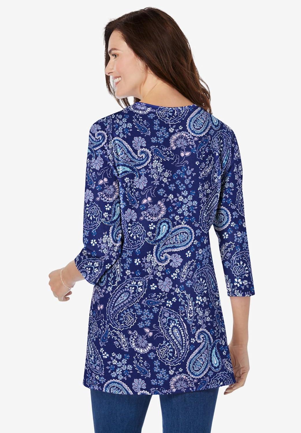 Woman Within Plus Size Perfect Printed Three-Quarter Sleeve Crewneck Tunic(Evening Blue Paisley)