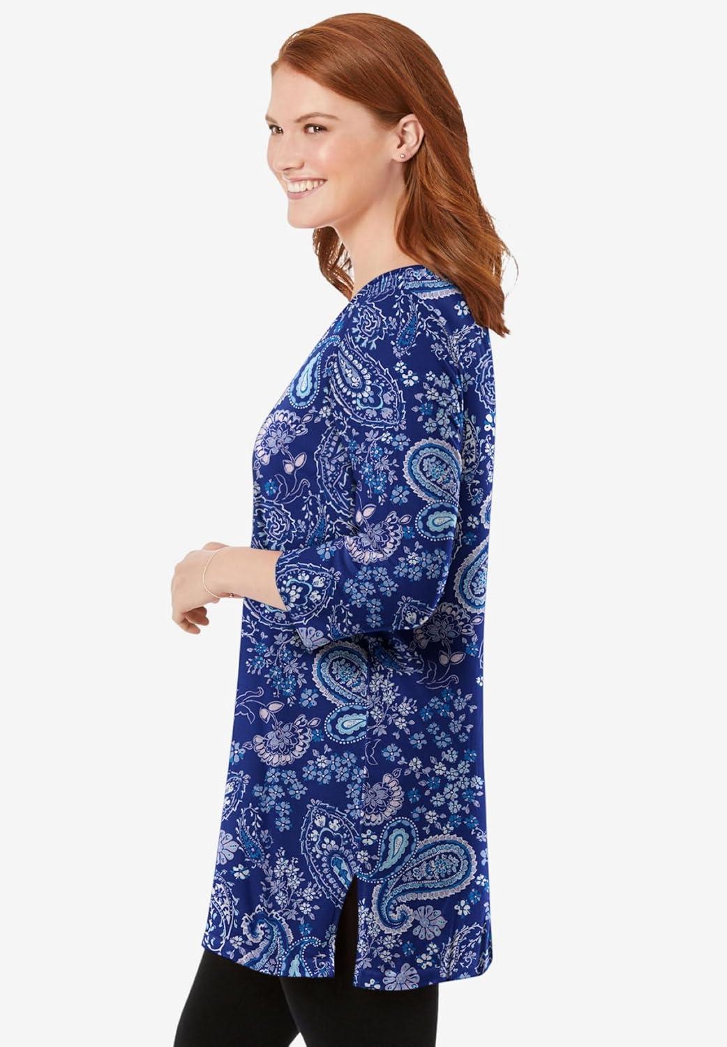 Woman Within Plus Size Perfect Printed Three-Quarter-Sleeve Scoopneck Tunic(Evening Blue Paisley)