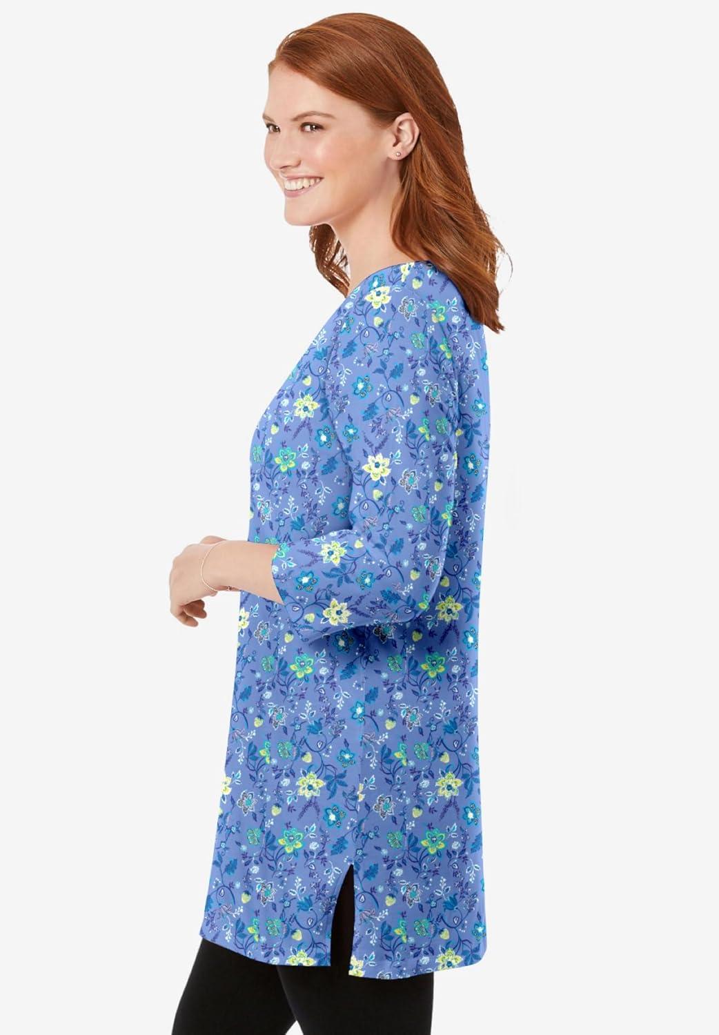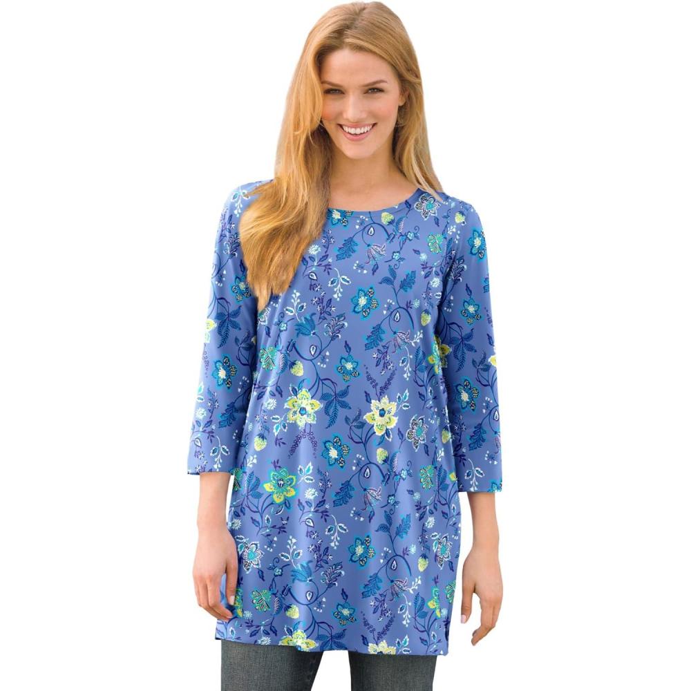 Woman Within Plus Size Perfect Printed Three-Quarter-Sleeve Scoopneck Tunic(French Blue Jacquard Floral)