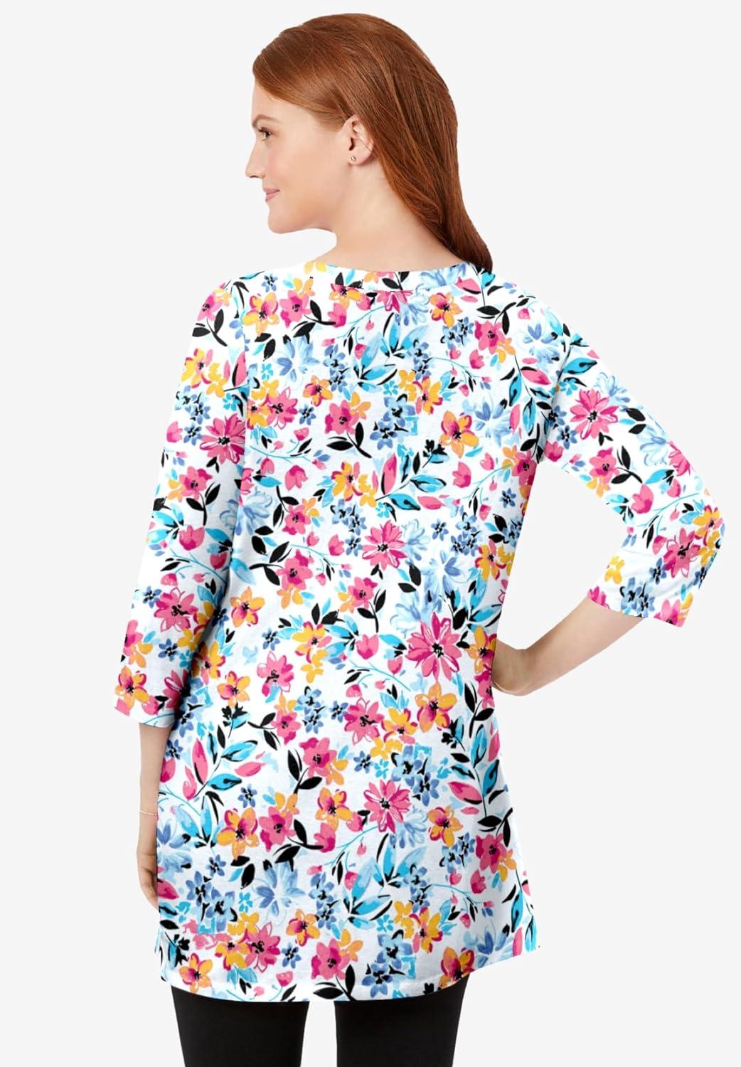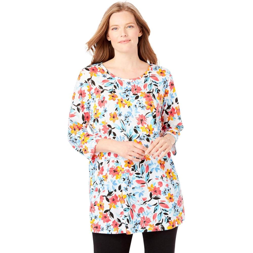 Woman Within Plus Size Perfect Printed Three-Quarter-Sleeve Scoopneck Tunic(White Painterly Bloom)