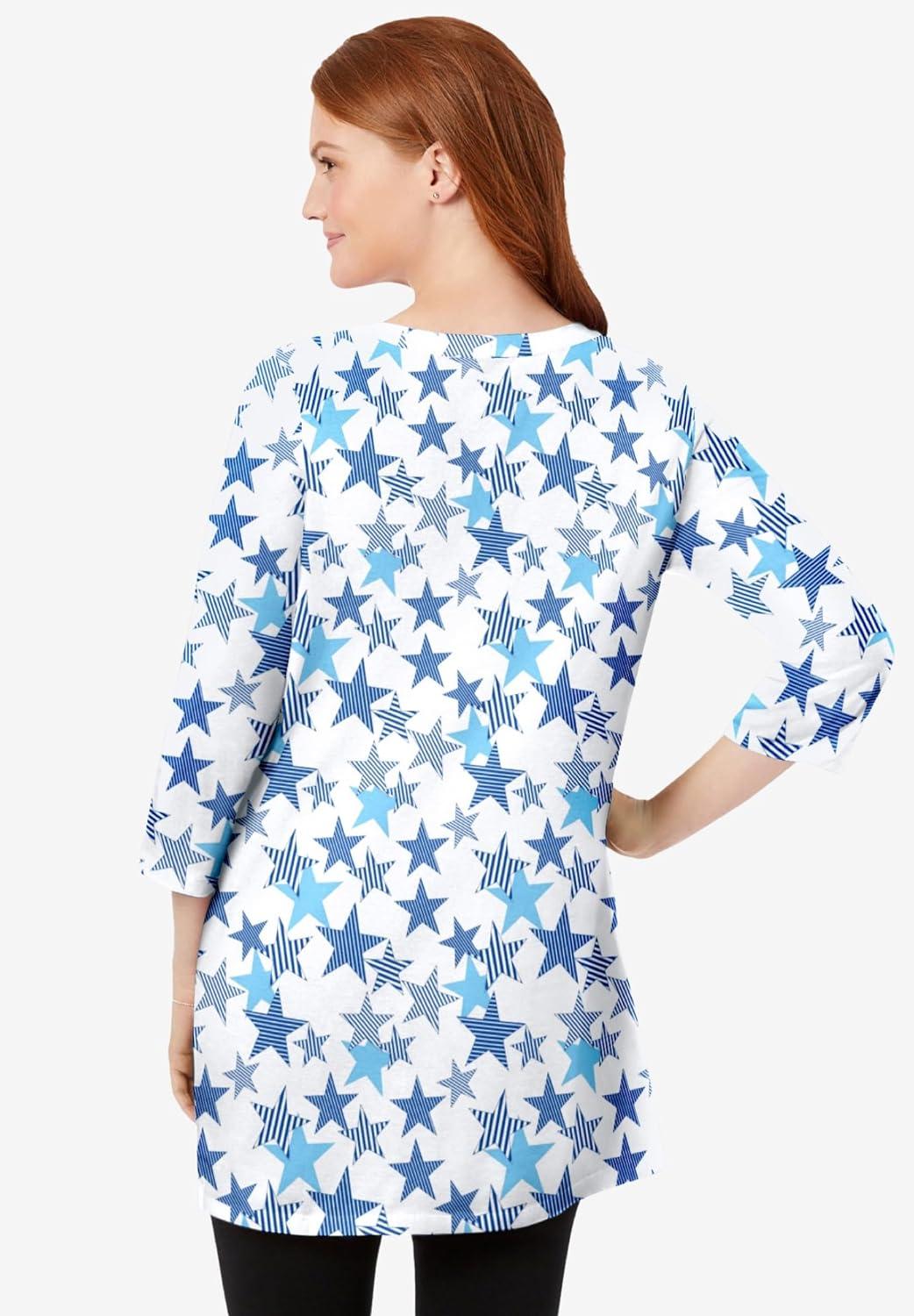 Woman Within Plus Size Perfect Printed Three-Quarter-Sleeve Scoopneck Tunic(White Striped Stars)