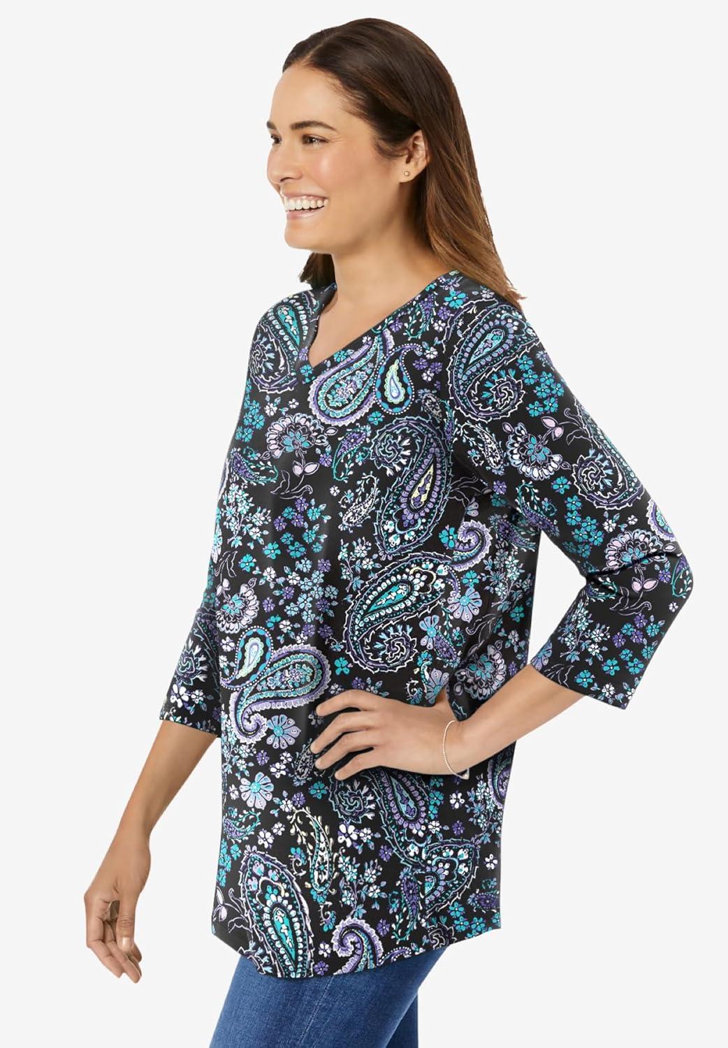 Woman Within Plus Size Perfect Printed Three-Quarter Sleeve V-Neck Tee(Black Paisley)