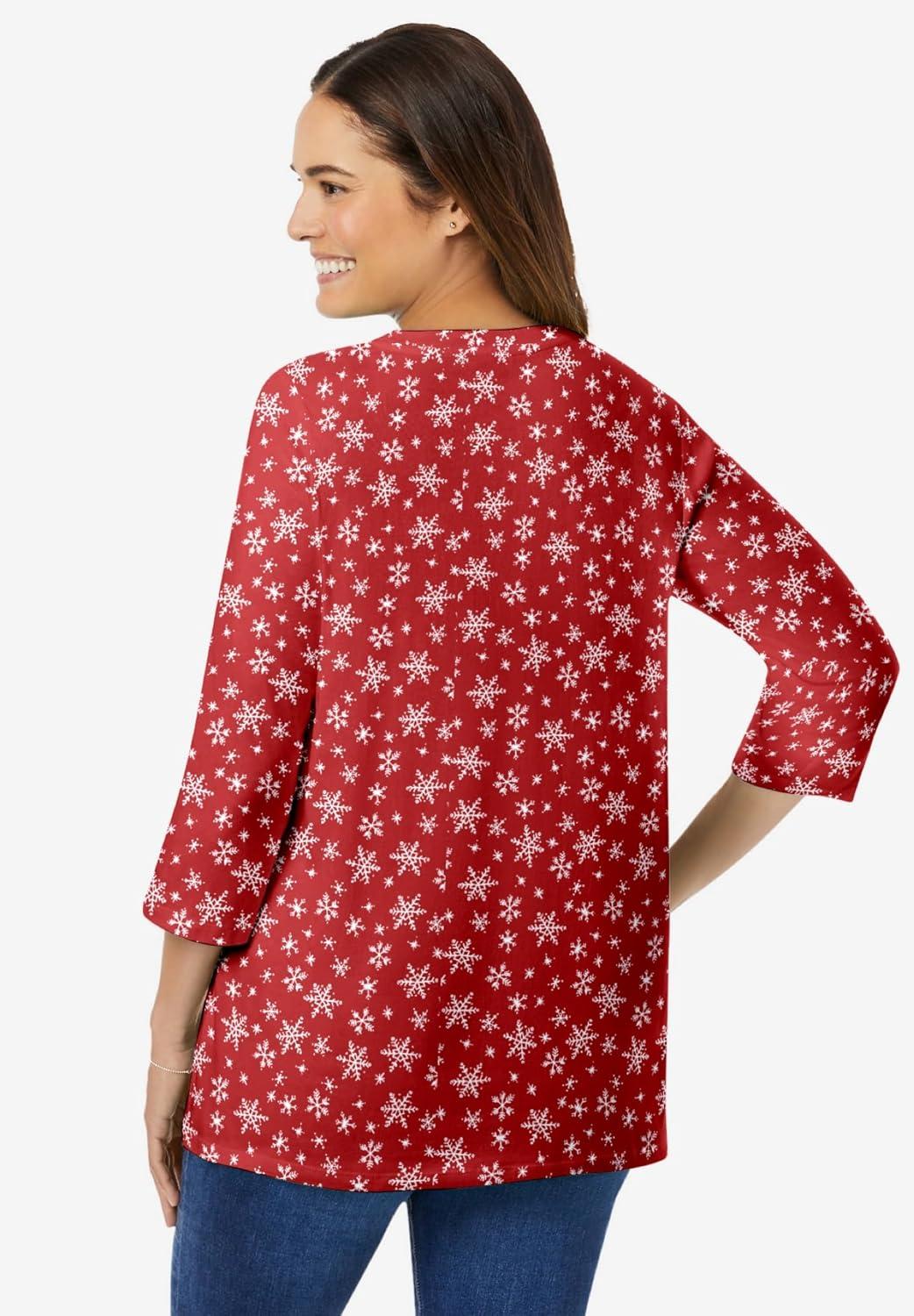 Woman Within Plus Size Perfect Printed Three-Quarter Sleeve V-Neck Tee(Classic Red Snowflakes)