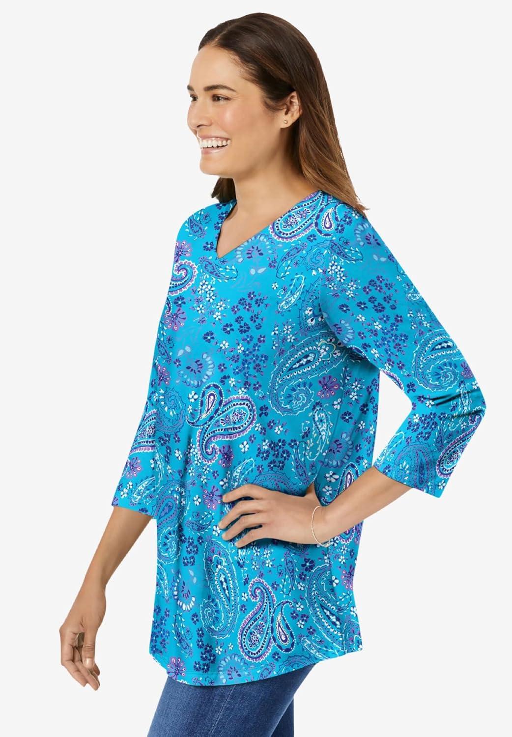 Woman Within Plus Size Perfect Printed Three-Quarter Sleeve V-Neck Tee(Pretty Turquoise Paisley)