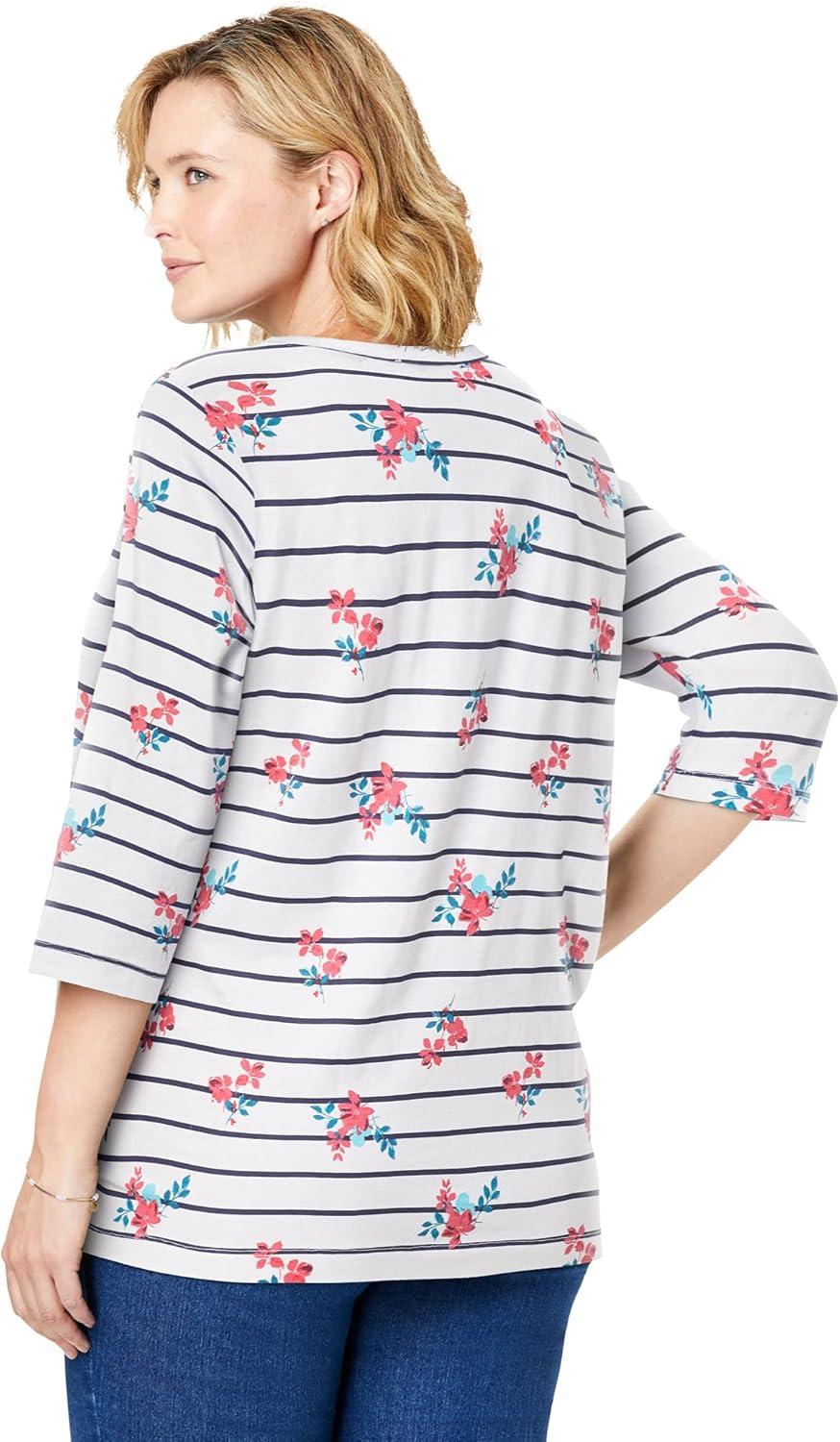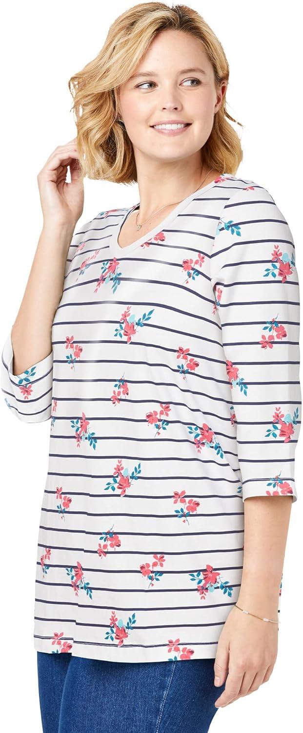 Woman Within Plus Size Perfect Printed Three-Quarter Sleeve V-Neck Tee(White Lovely Ditsy)