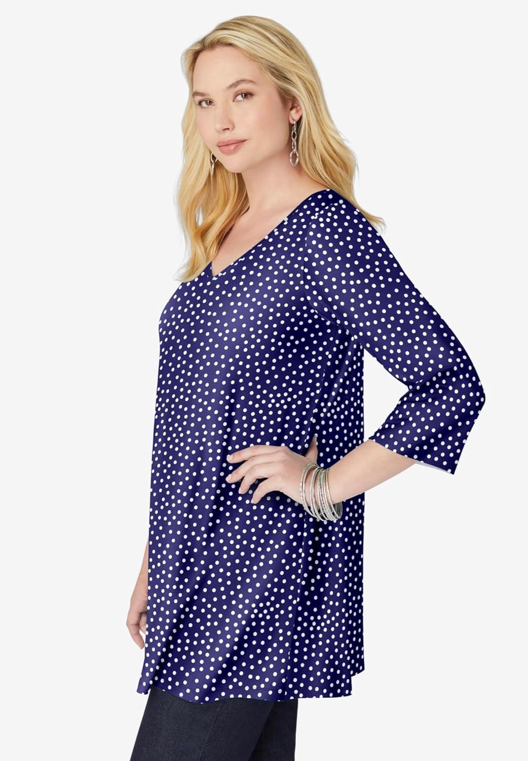 Woman Within Plus Size Perfect Printed Three-Quarter-Sleeve V-Neck Tunic(Navy Offset Dot)