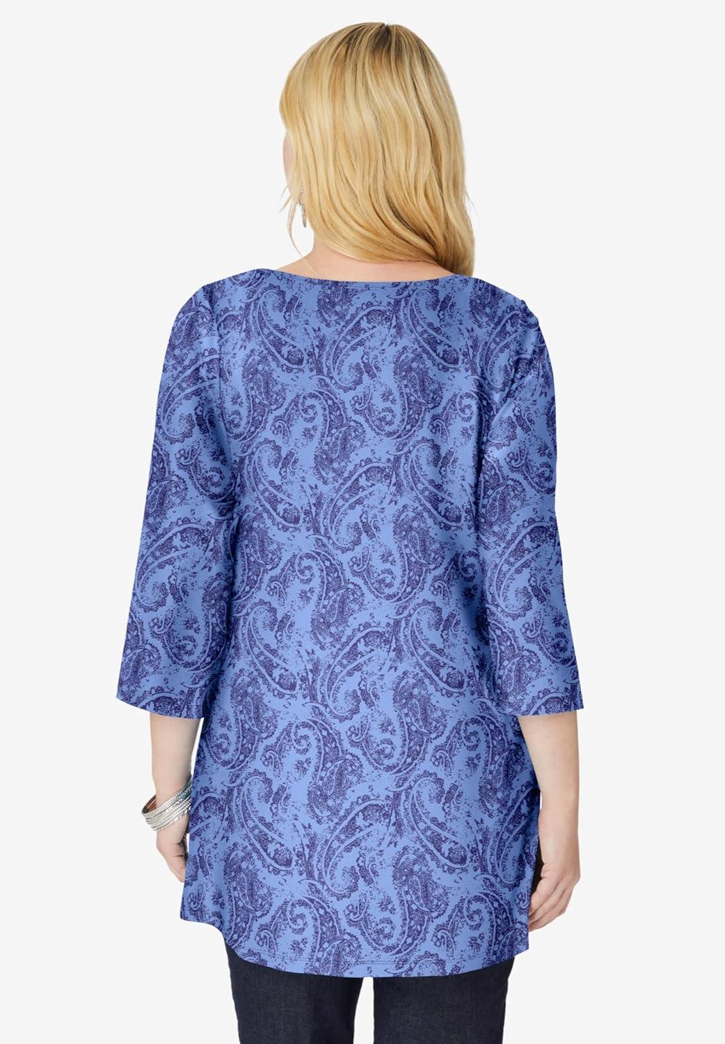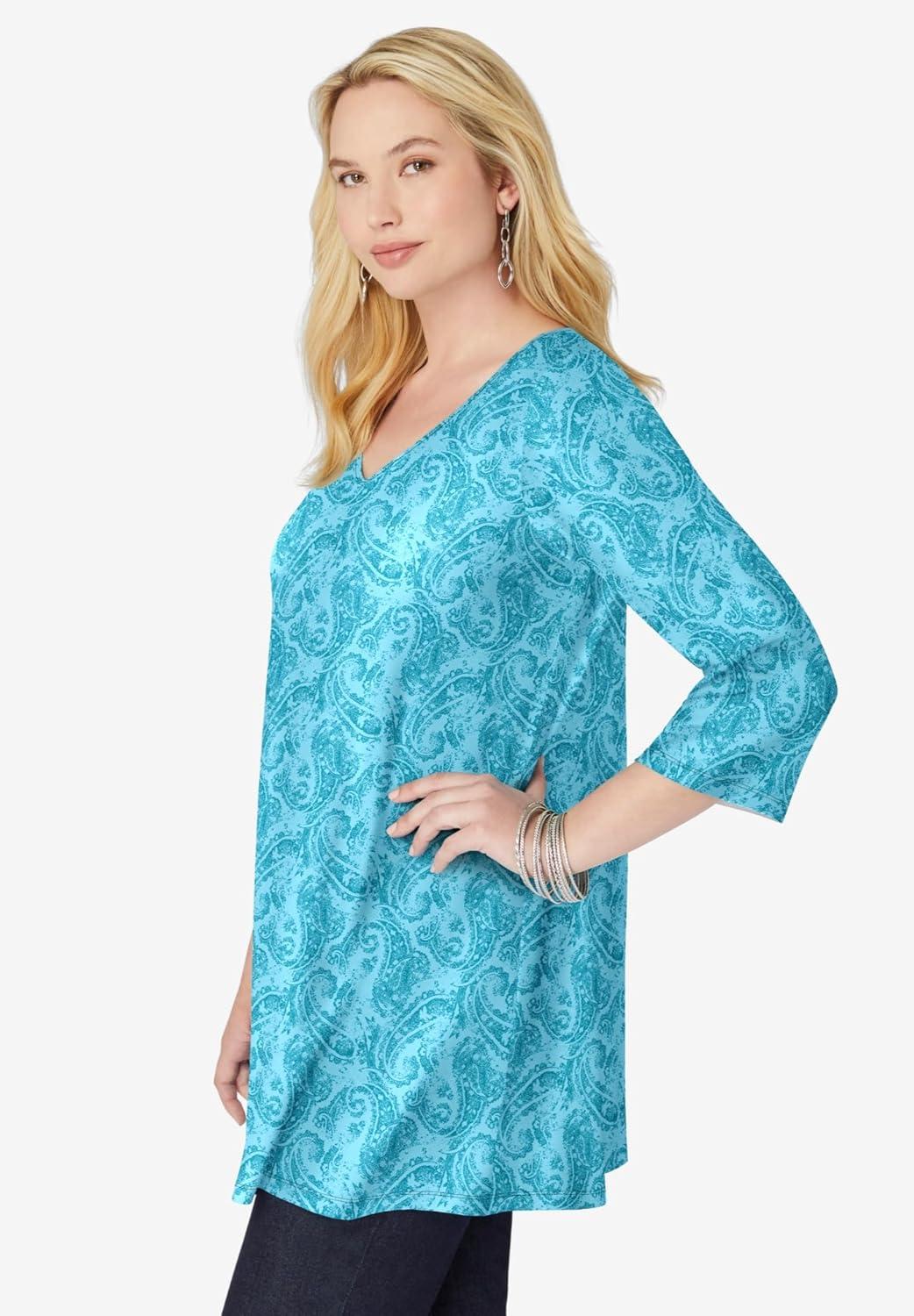 Woman Within Plus Size Perfect Printed Three-Quarter-Sleeve V-Neck Tunic(Royal Navy Tie Dye)