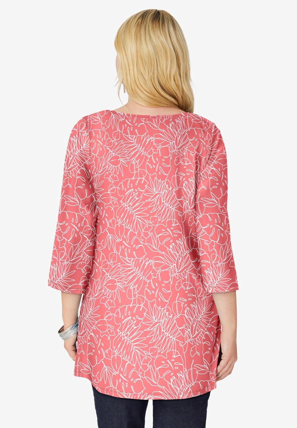 Woman Within Plus Size Perfect Printed Three-Quarter-Sleeve V-Neck Tunic(Sweet Coral Palm)