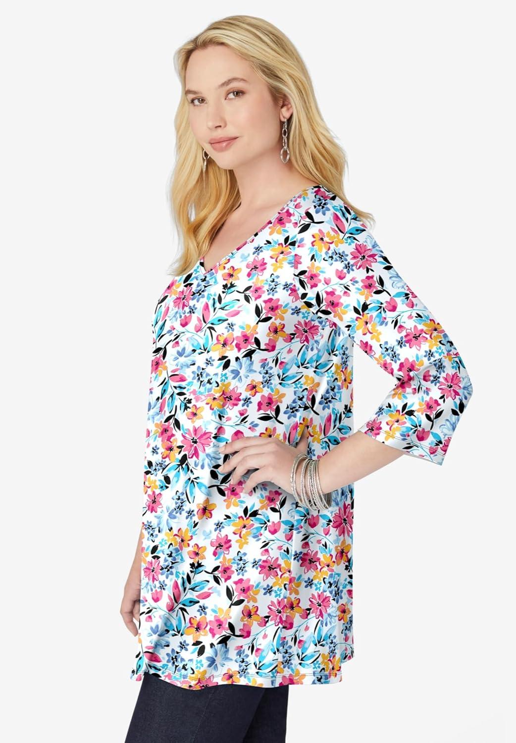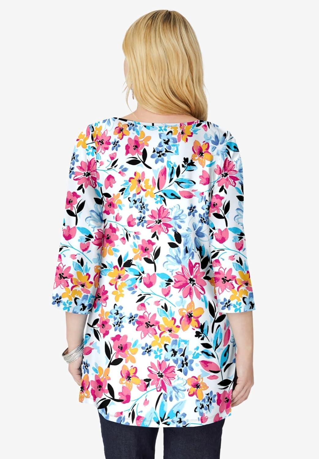 Woman Within Plus Size Perfect Printed Three-Quarter-Sleeve V-Neck Tunic(White Painterly Bloom)