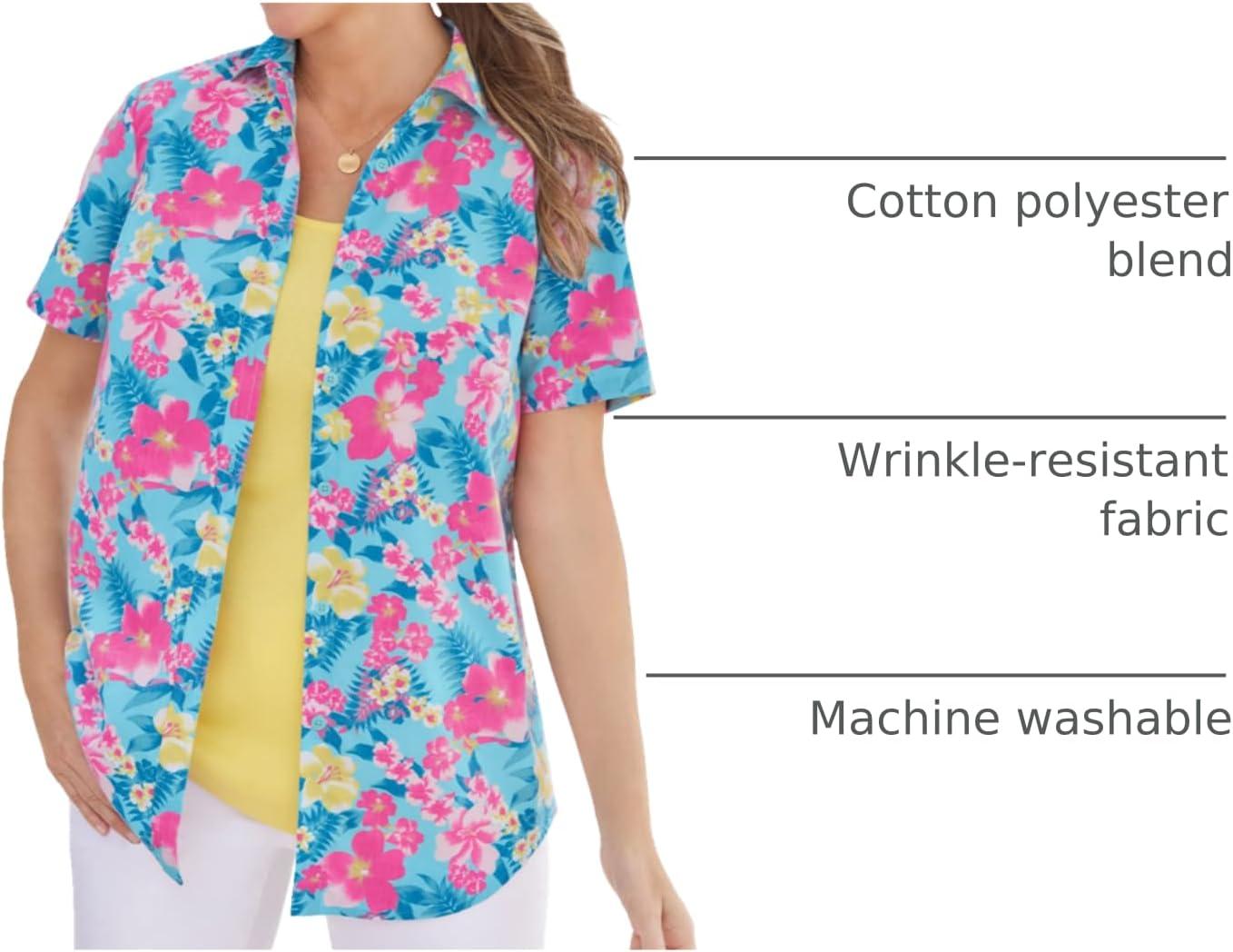 Enjoy exceptional comfort with our best-selling Perfect Short Sleeve Shirt, designed to boost your confidence. br> Classic and stylish, this shirt provides just the right amount of coverage. br> Made from wrinkle-resistant fabric, it's truly a wash-and-wear wonder. br> Features a sophisticated shirt collar and button front closure for a polished look. br> Short sleeves offer a breezy, comfortable fit for everyday wear. br> Shirttail hem adds a flattering touch and versatile styling options. br> Average: 30″ length. br> Petite: 28″ length. br> Woven from a durable cotton/polyester blend for lasting wear. br> Machine washable for easy care and maintenance. br> Imported