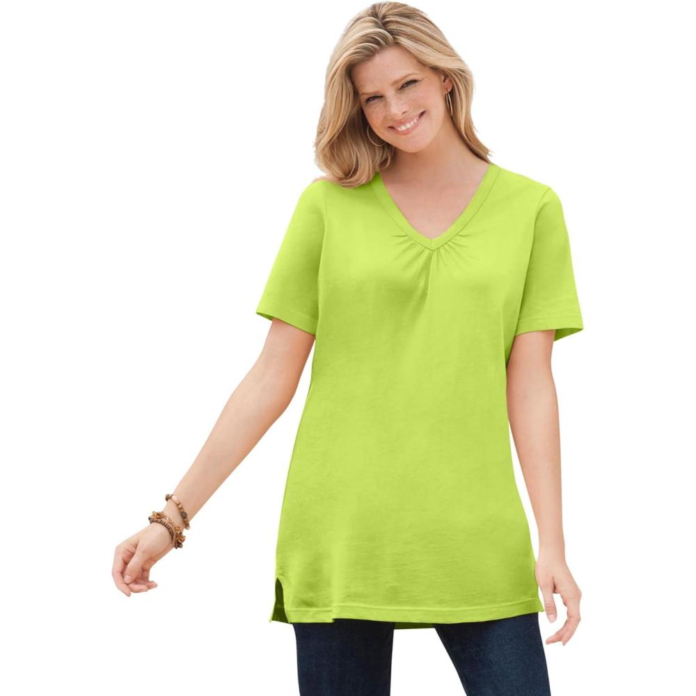 Woman Within Plus Size Perfect Short-Sleeve Shirred V-Neck Tunic(Lime)