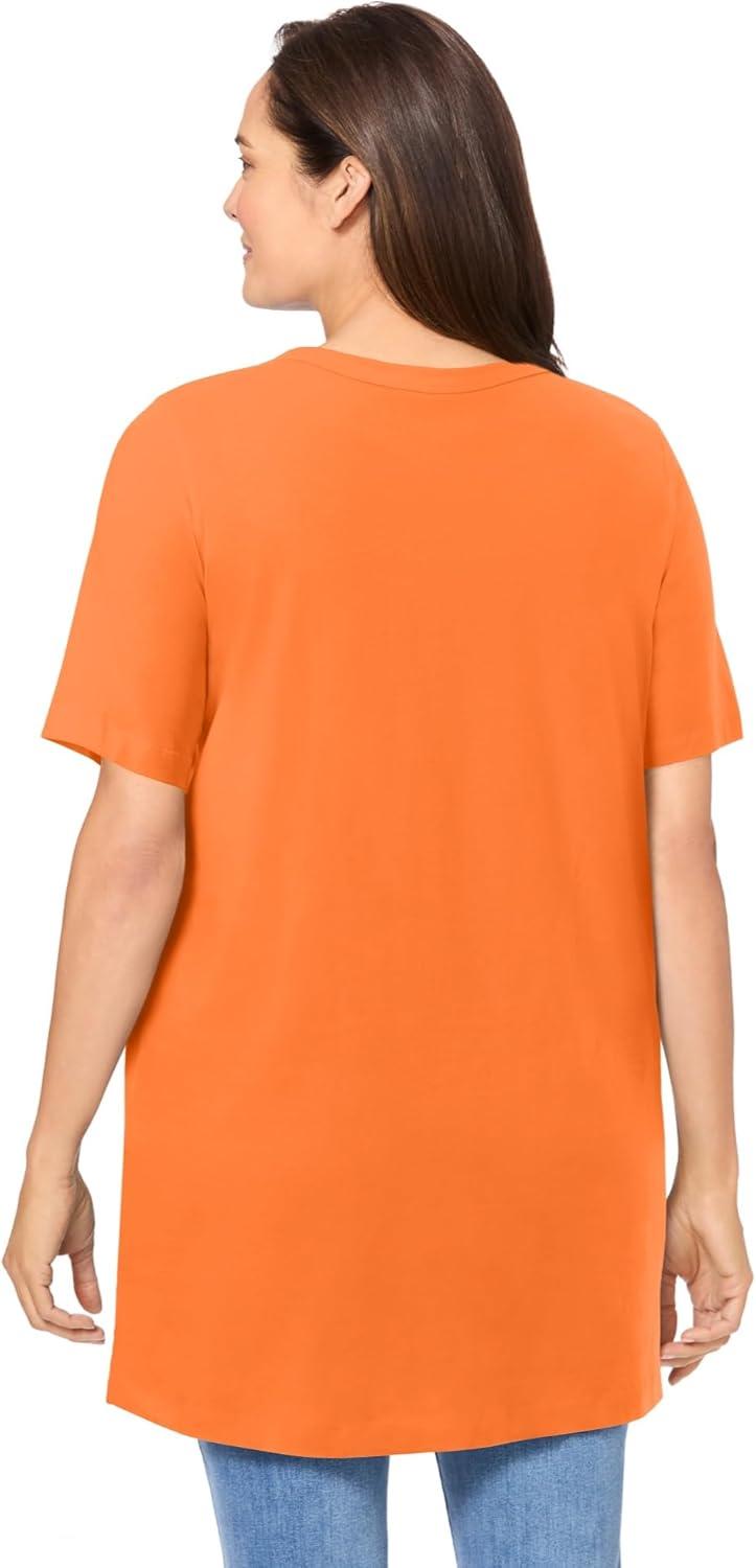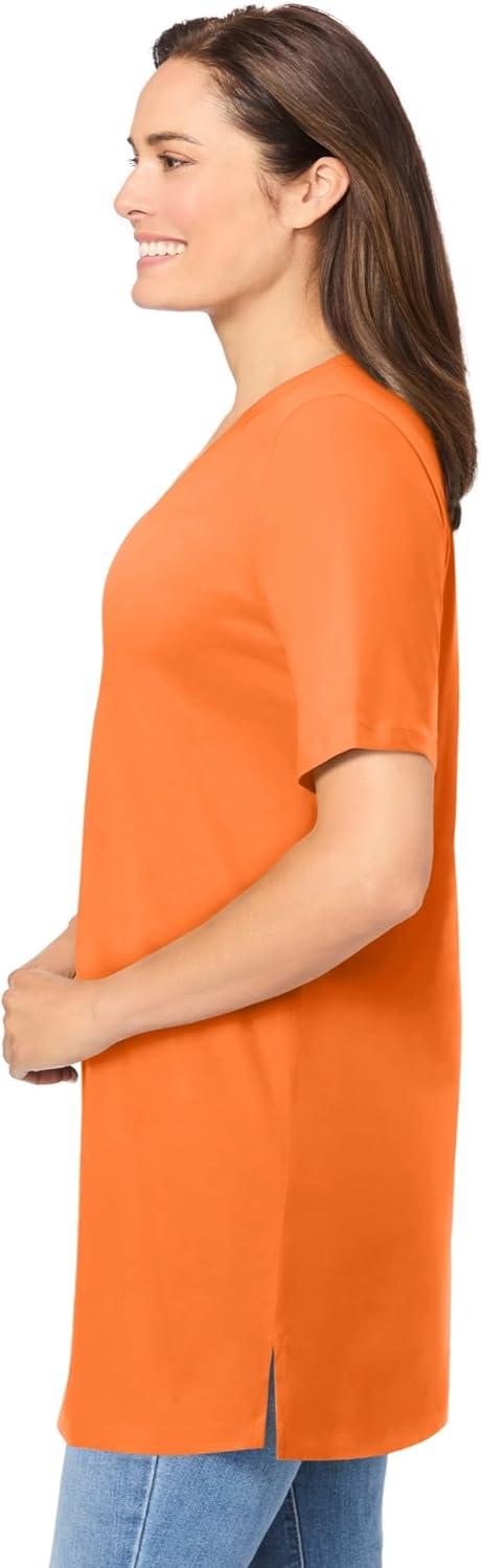 Woman Within Plus Size Perfect Short-Sleeve Shirred V-Neck Tunic(Orange Twist)
