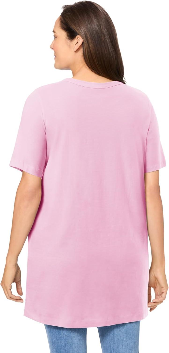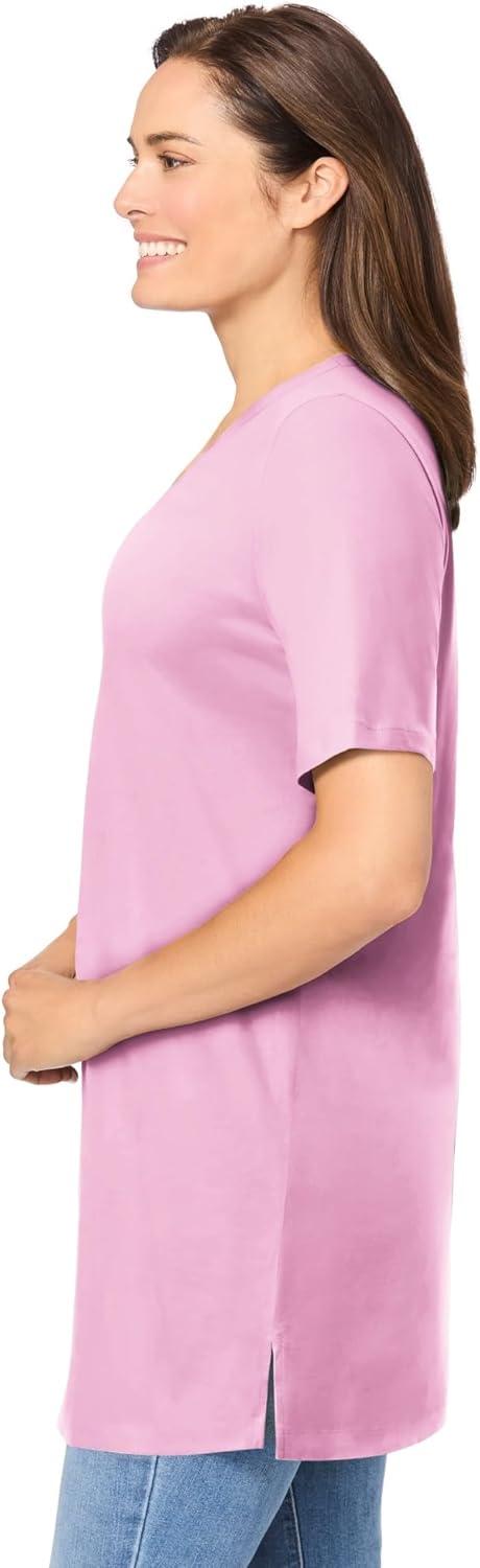 Woman Within Plus Size Perfect Short-Sleeve Shirred V-Neck Tunic(Pink)