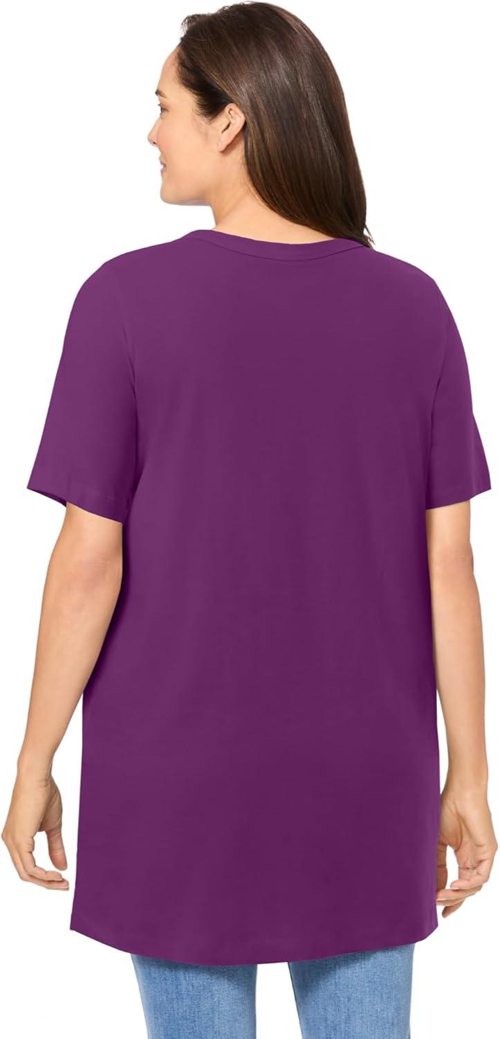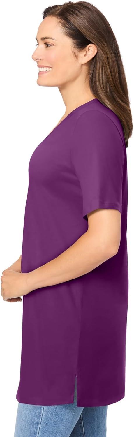Woman Within Plus Size Perfect Short-Sleeve Shirred V-Neck Tunic(Plum Purple)