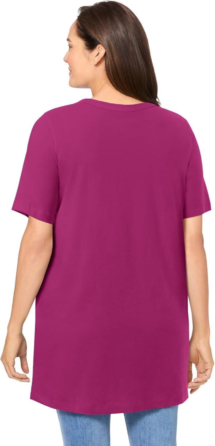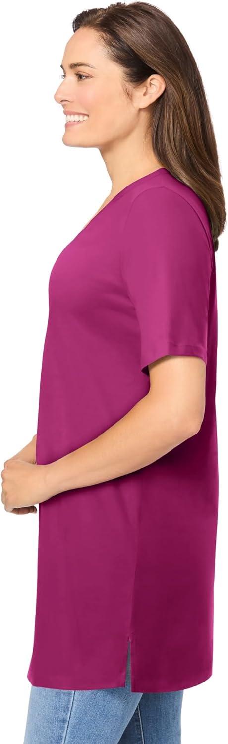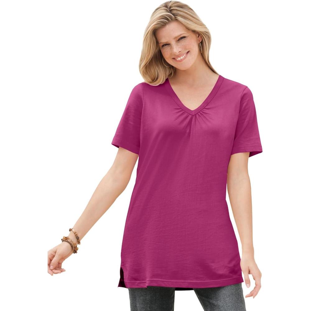 Woman Within Plus Size Perfect Short-Sleeve Shirred V-Neck Tunic(Raspberry)