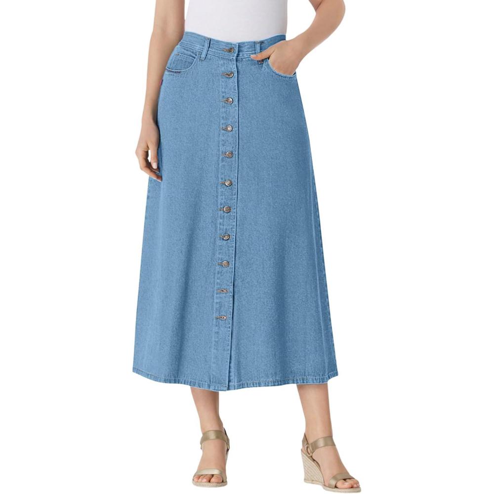 Woman Within Plus Size Perfect Side-Elastic All-Cotton Button Front Denim Jeans Skirt(Light Stonewash)