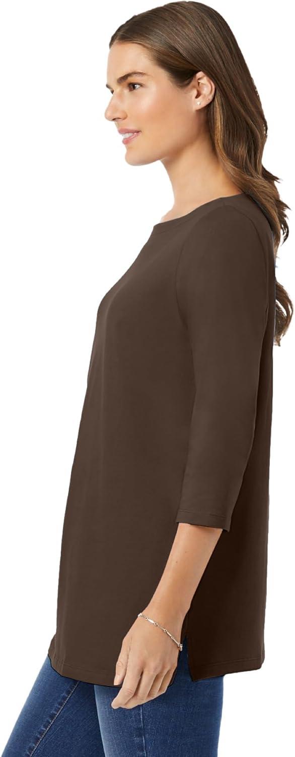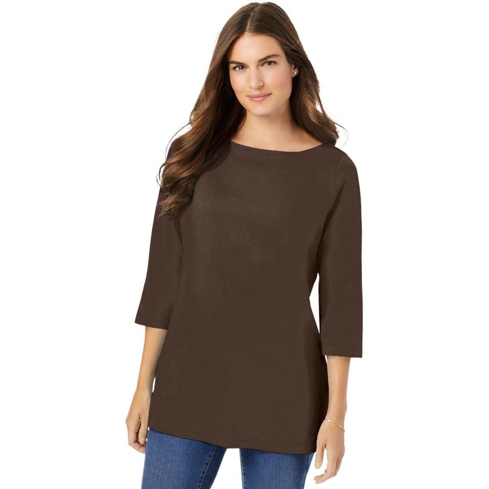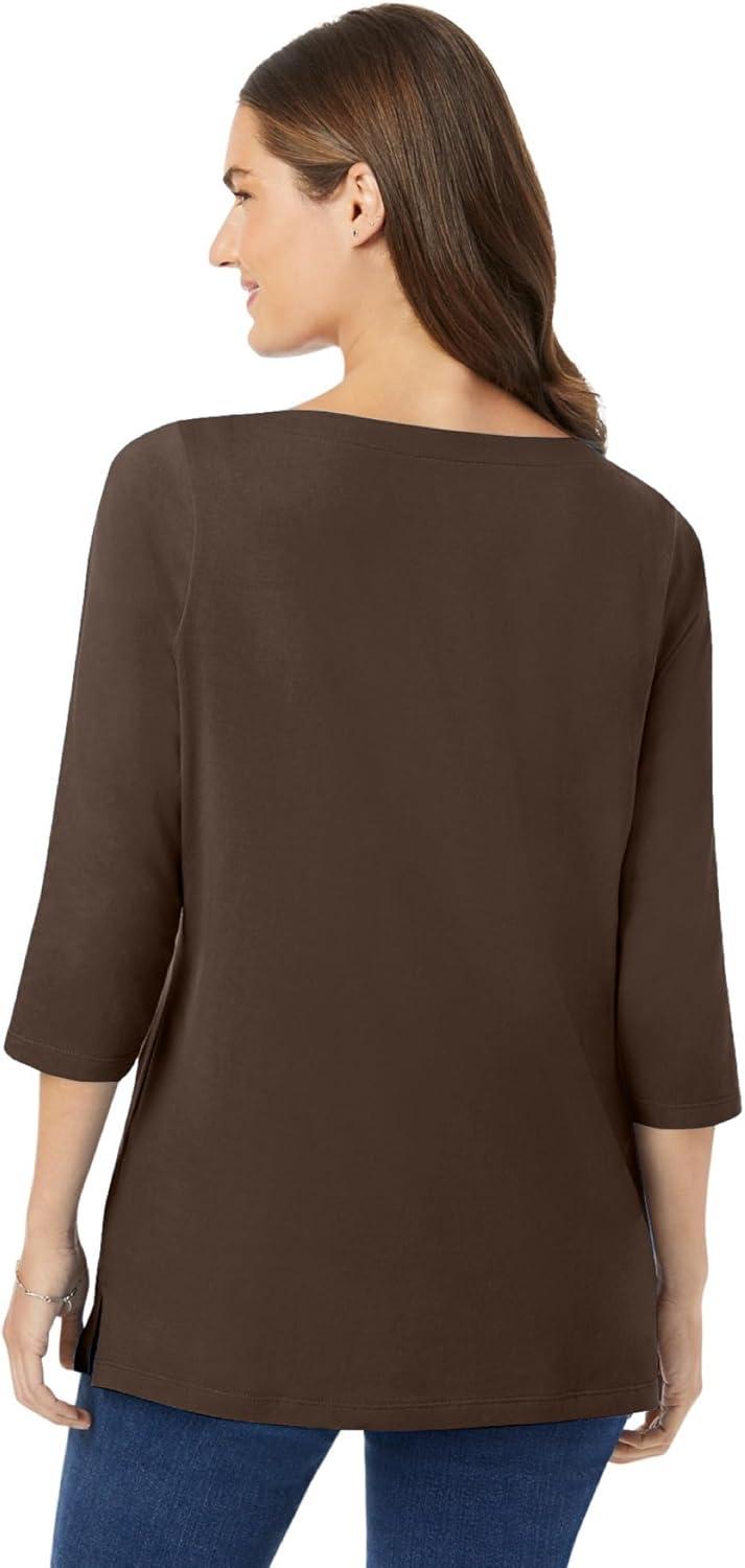 Woman Within Plus Size Perfect Three-Quarter Sleeve Boatneck Tee(Chocolate)