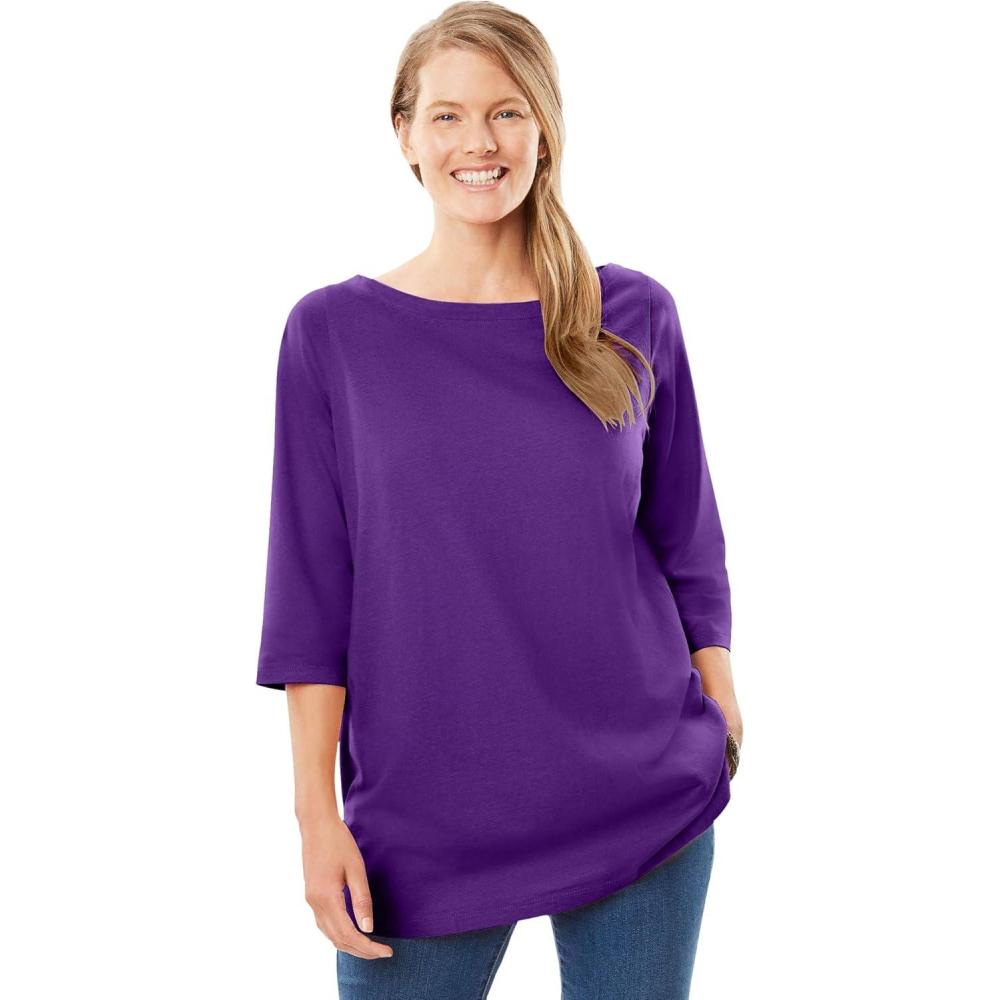 Woman Within Plus Size Perfect Three-Quarter Sleeve Boatneck Tee(Radiant Purple)