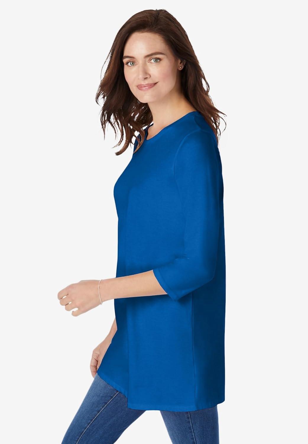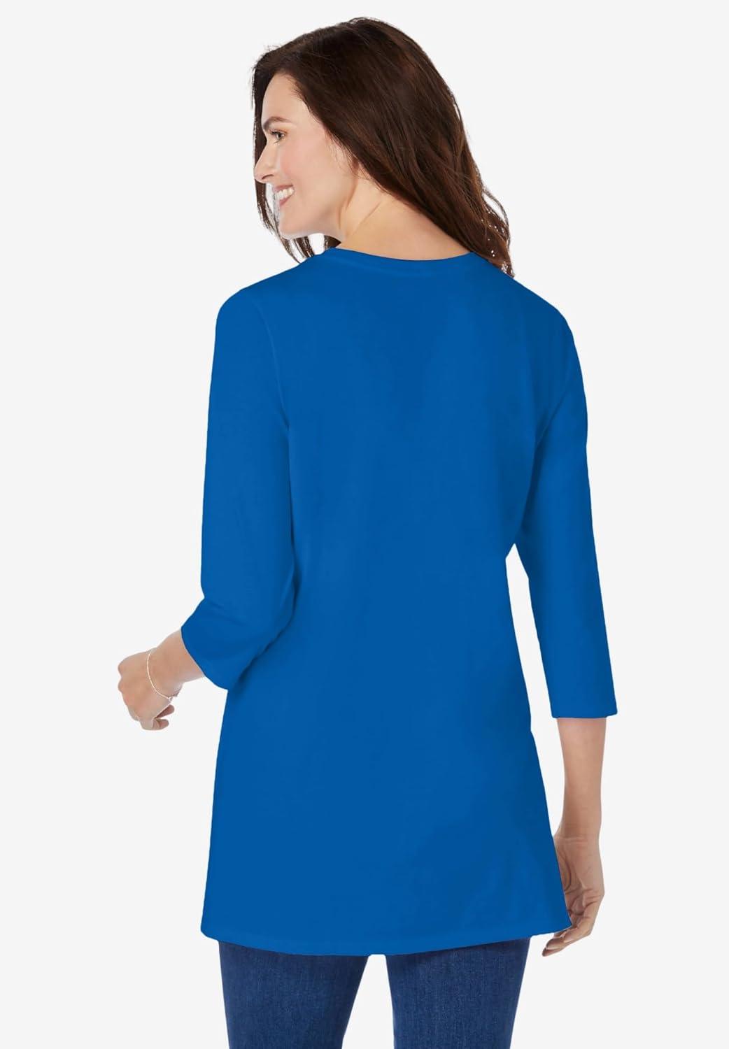 Woman Within Plus Size Perfect Three-Quarter Sleeve Crewneck Tunic(Bright Cobalt)