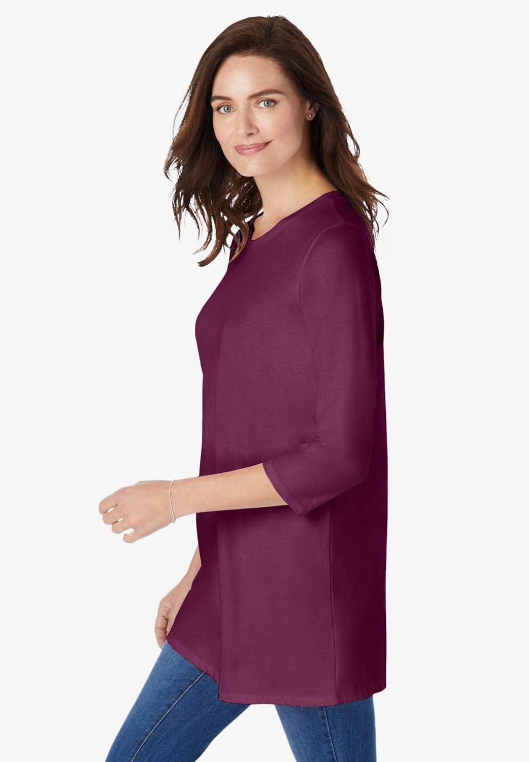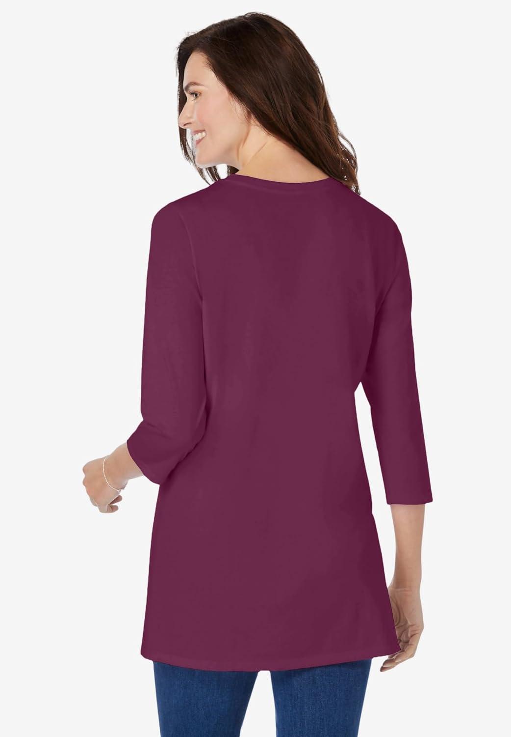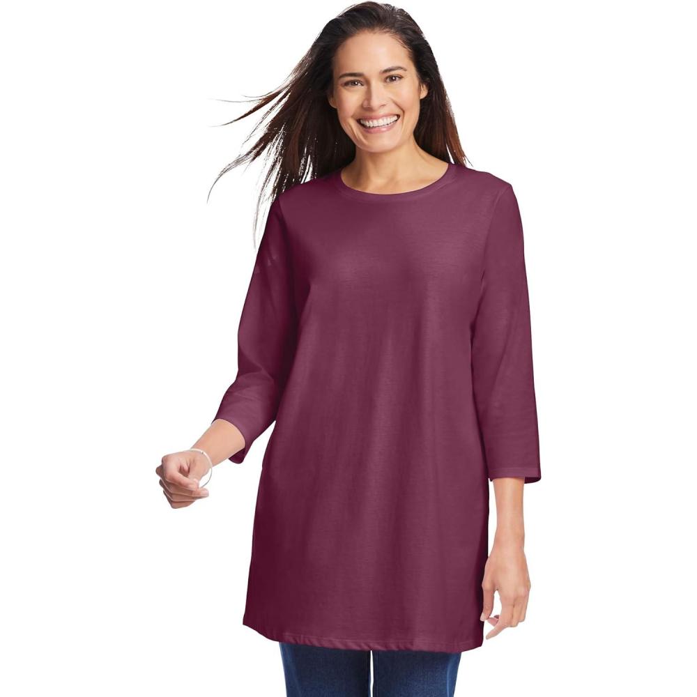 Woman Within Plus Size Perfect Three-Quarter Sleeve Crewneck Tunic(Deep Claret)