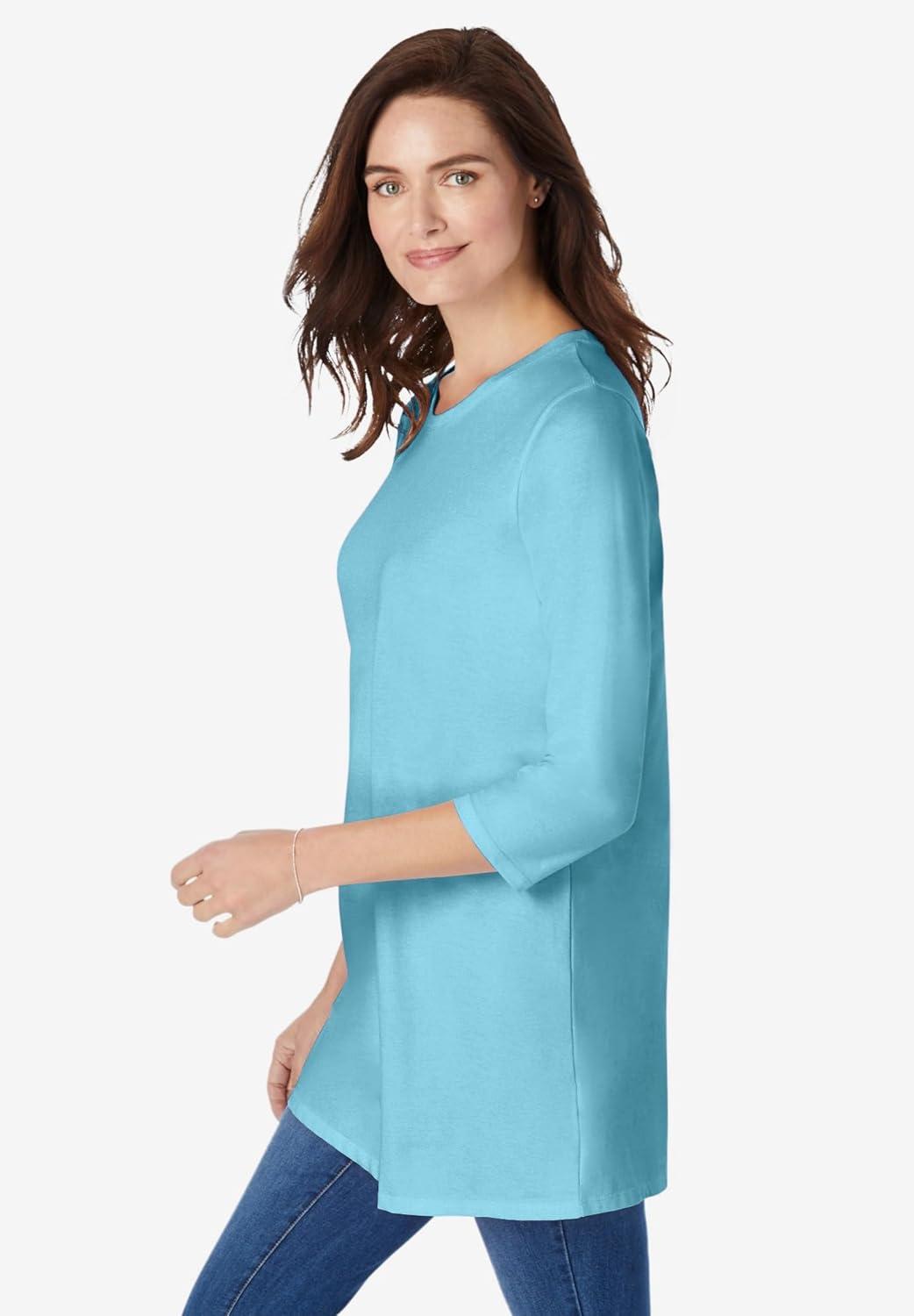Woman Within Plus Size Perfect Three-Quarter Sleeve Crewneck Tunic(Seamist Blue)