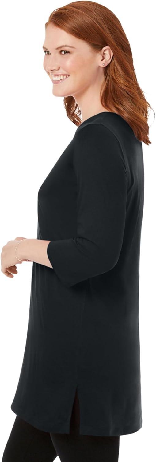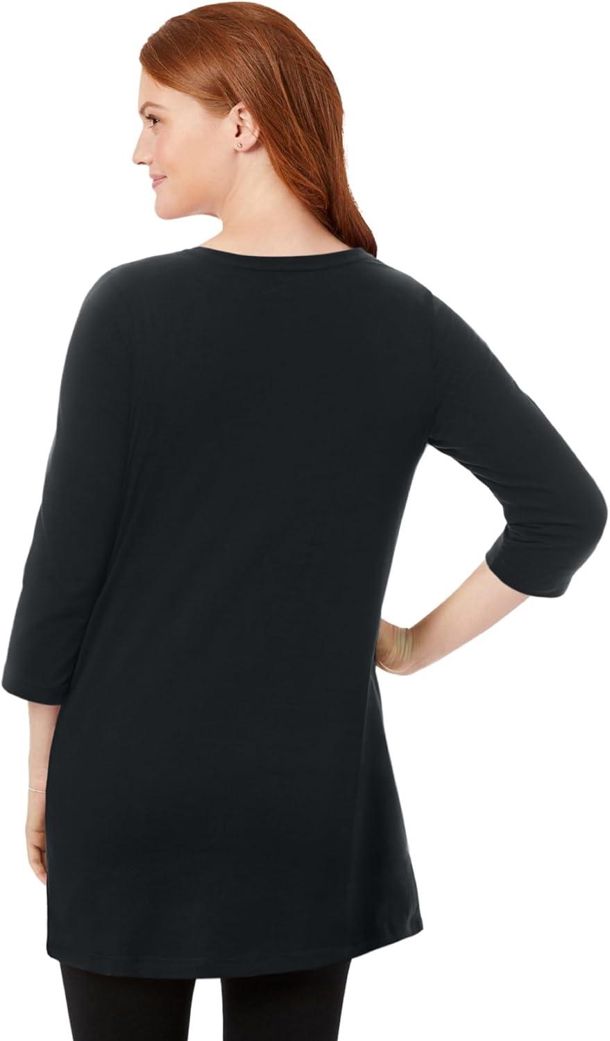 Woman Within Plus Size Perfect Three-Quarter-Sleeve Scoopneck Tunic(Black)