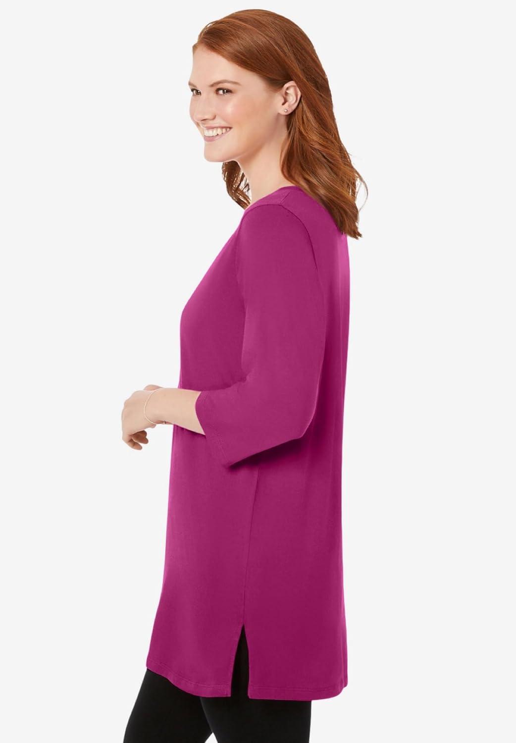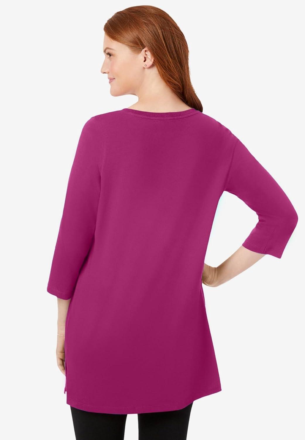 Woman Within Plus Size Perfect Three-Quarter-Sleeve Scoopneck Tunic(Raspberry)