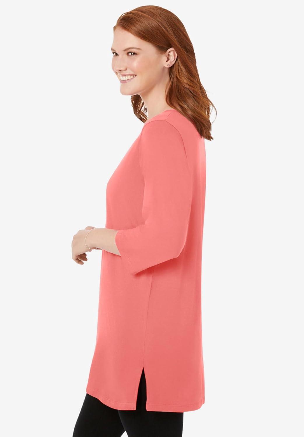 Woman Within Plus Size Perfect Three-Quarter-Sleeve Scoopneck Tunic(Sweet Coral)