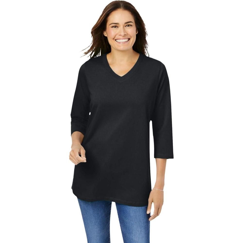 Woman Within Plus Size Perfect Three-Quarter Sleeve V-Neck Tee (Petite Available)(Black)