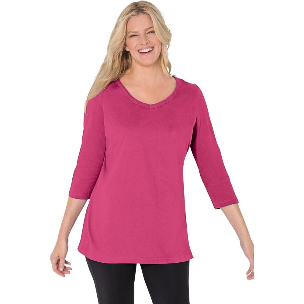 Woman Within Plus Size Perfect Three-Quarter Sleeve V-Neck Tee (Petite Available)(Raspberry)