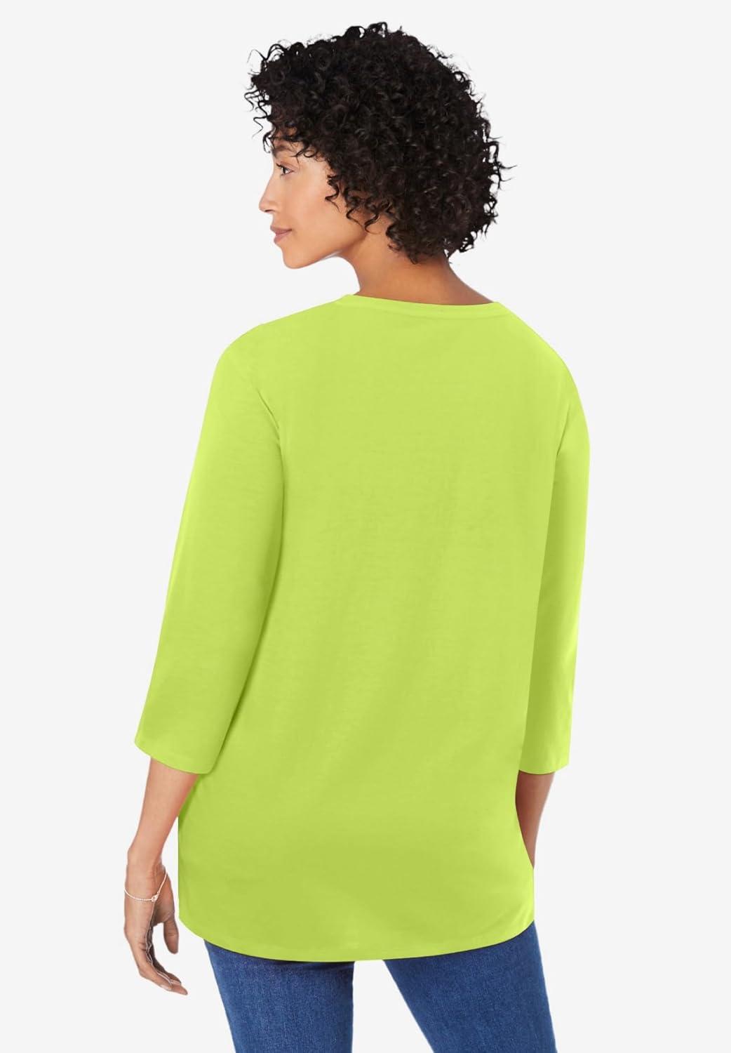 Woman Within Plus Size Perfect Three-Quarter Sleeve V-Neck Tunic(Lime)