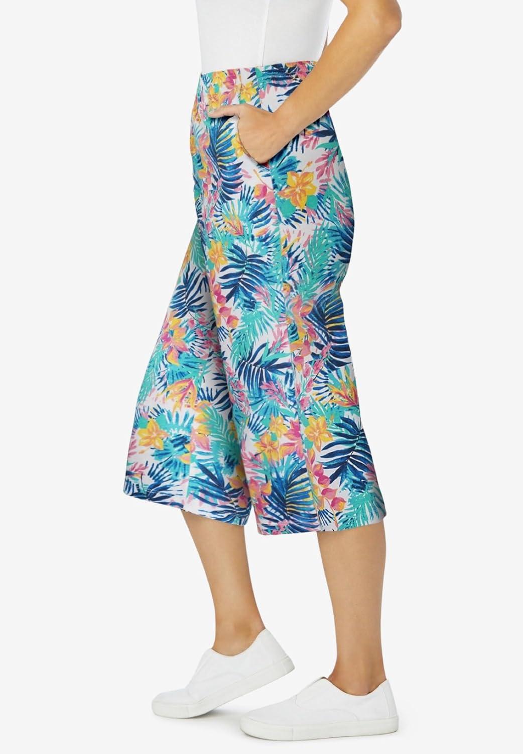 Woman Within Plus Size Petite Elastic-Waist Pull-On Knit Pocket Capri Pants(White Multi Tropicana)