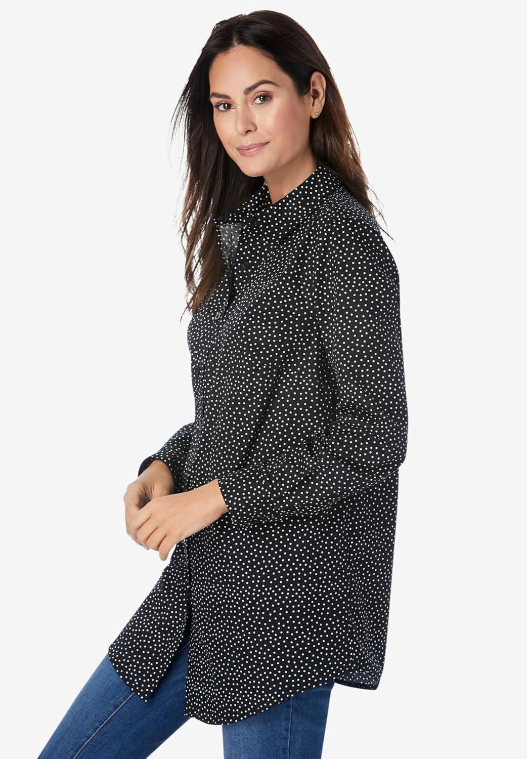 Woman Within Plus Size Petite Perfect Long Sleeve Shirt(Black Allover Dot)