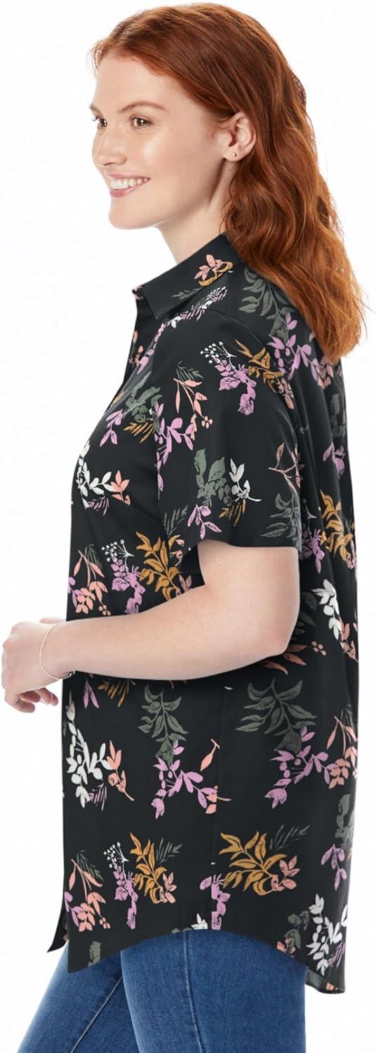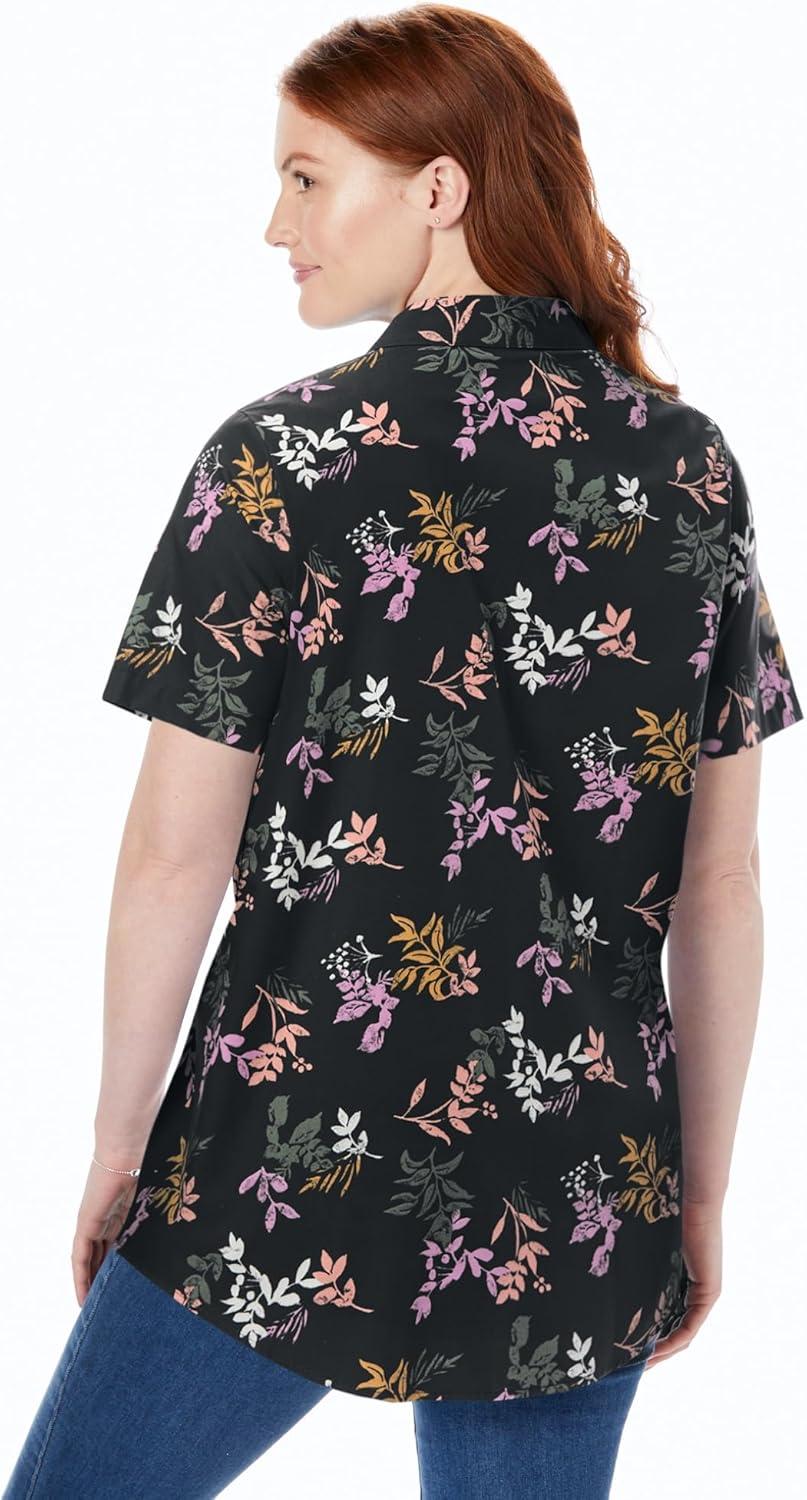 Woman Within Plus Size Petite Perfect Short Sleeve Shirt(Black Multi Leaves)