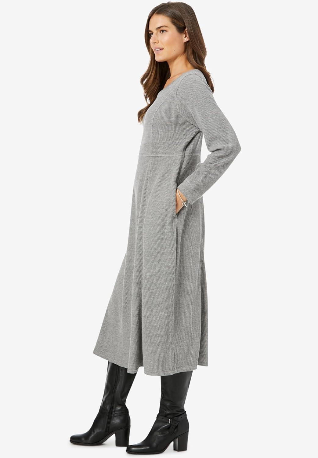 This textured thermal dress with an empire waist designed with feminine princess seams. The roomy A-line silhouette offers a cling-free fit for total comfort. Side pockets br> Average: 45” length br> Petite: 42″ length br> Cotton/poly, imported br> Machine washable