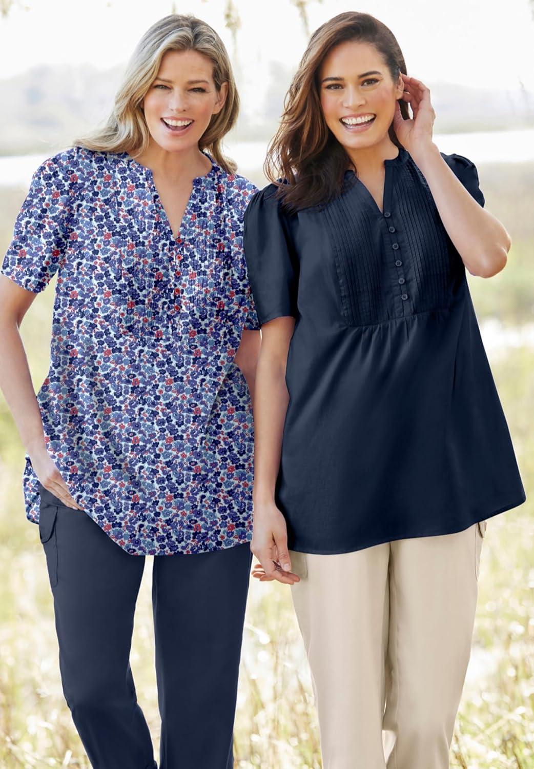 Feel confident and stylish with our Pintucked Half-Button Tunic, designed for a relaxed, comfortable fit. br> The flattering silhouette effortlessly complements your figure, creating an elegant, easy-to-wear top. br> Features a chic y-neckline and pintucked button front for a touch of sophistication and style. br> Made from 100% woven cotton, this blouse feels lightweight and breathable, perfect for year-round wear. br> Enjoy the tunic's versatile 30″ length, ideal for pairing with your favorite jeans or leggings for a complete look. br> Machine washable for easy care, so you can look great with minimal effort. br> Imported, ensuring high-quality craftsmanship.