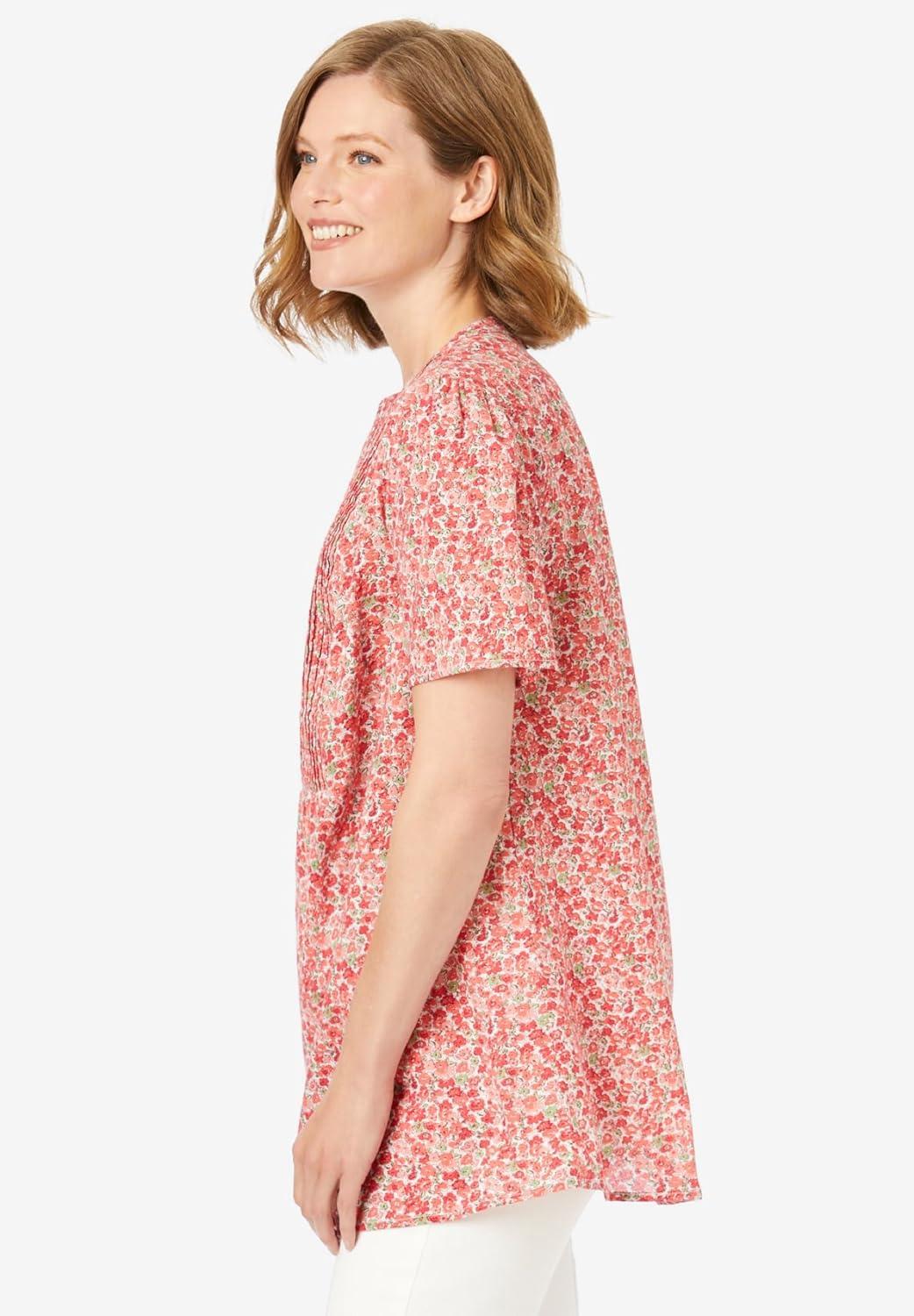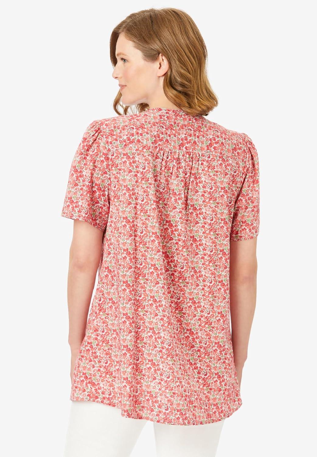 Woman Within Plus Size Pintucked Half-Button Tunic(Sweet Coral Blooming Ditsy)