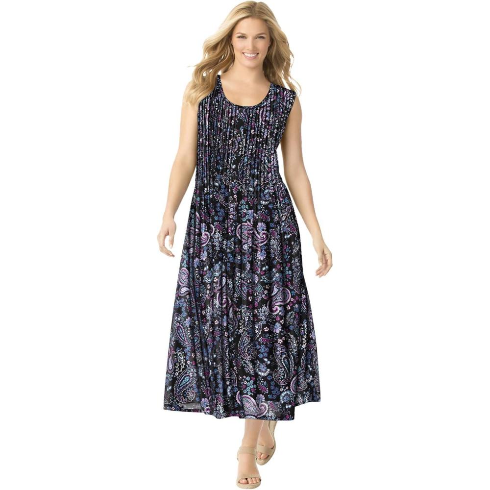 Woman Within Plus Size Pintucked Sleeveless Dress(Black Paisley)