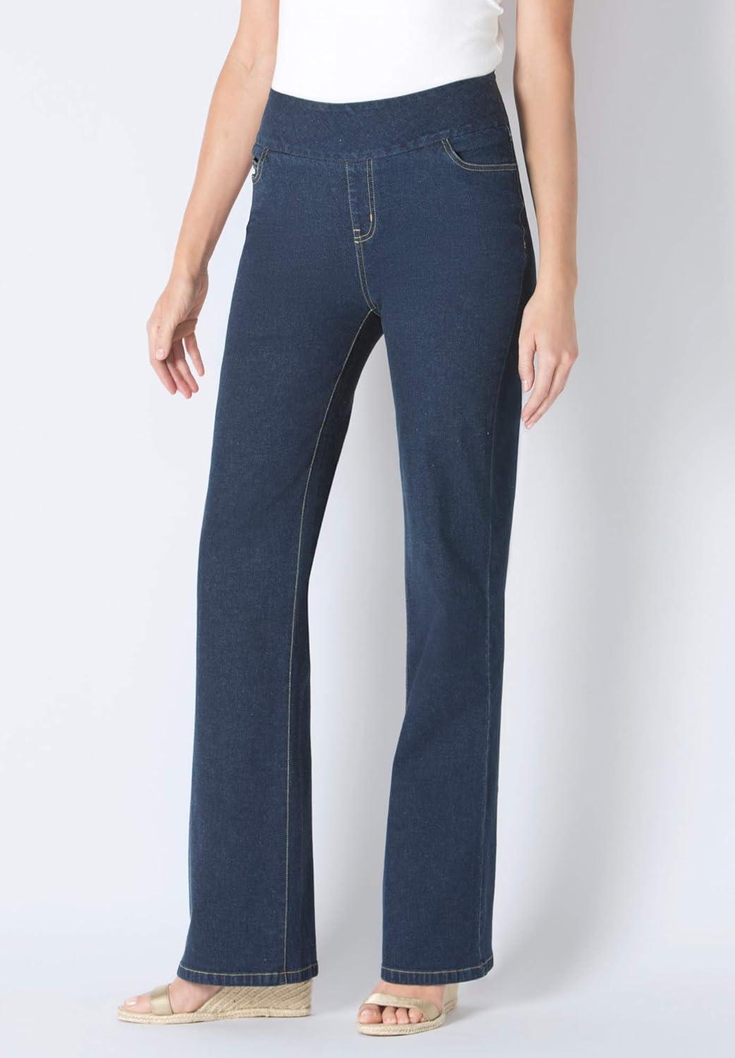 These easy, bootcut stretch denim jeans are designed with a full flat, no-gap elastic waistband. The jeans provide a smooth look under all your favorite tops and tunics. Enjoy the classic look of a great pair of jeans but move comfortably thanks to allover stretch. Crafted with a full flat-elastic waistband that lays smoothly on your waist, perfect for all-day wear. br> The mock fly ensures a sleek look under your favorite tops and tunics, enhancing your silhouette. br> Lies flat under your tops and sits right over your hips. br> Enjoy the freedom of movement with soft stretch denim that adapts to your body while providing a relaxed yet secure fit. br> Practical and convenient flat front pockets and back pockets offer ample storage for your essentials. br> Available in Average (31″ inseam), Petite (29″ inseam), and Tall (34″ inseam) sizes to suit every body type. br> Made from a durable blend of cotton, polyester, and spandex for long-lasting wear. br> Machine washable for easy care and maintenance. br> Imported.