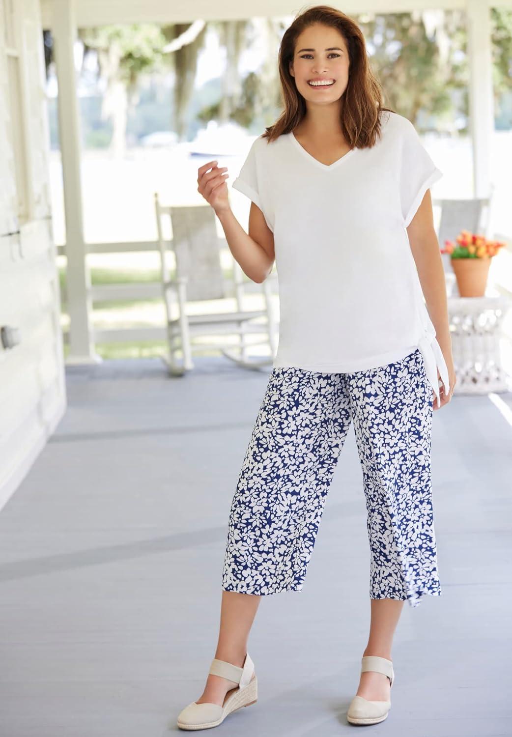 Pull-on soft capris in a relaxed fit for cool and easy comfort all spring and summer. Made with a full elastic waistband for pull-on ease. Side pockets br> 21″ inseam br> Rayon, imported br> Machine washable
