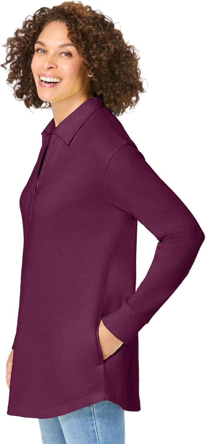 Our best-selling thermal waffle knit tunic. Great for layering in fall to winter, its softly textured waffle knit fabric is perfect for all-year-around. New and improved silhouette promises to be your go-to for great texture, color and fit in our thermal collection. Also, designed with side pockets for your go-to items. Stay comfortable in this casual long-sleeve style available in variety of colors and prints. V-neckline br> Relaxed fit br> Shirttail hem br> 30” length br> Cotton/poly; imported br> Machine wash