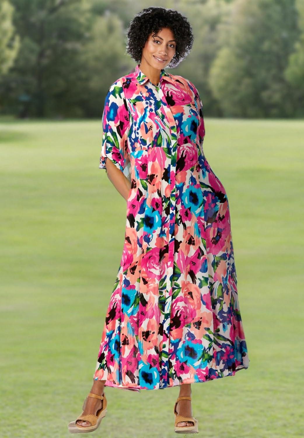Woman Within Plus Size Roll-Tab Sleeve Crinkle Shirtdress(Dark Basil Floral)