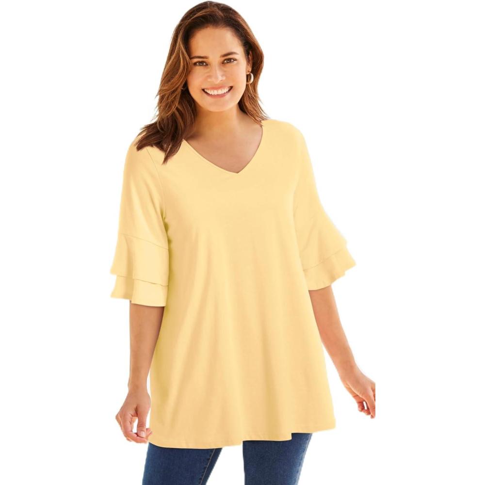 Woman Within Plus Size Ruffled Elbow-Sleeve Tunic(Banana)